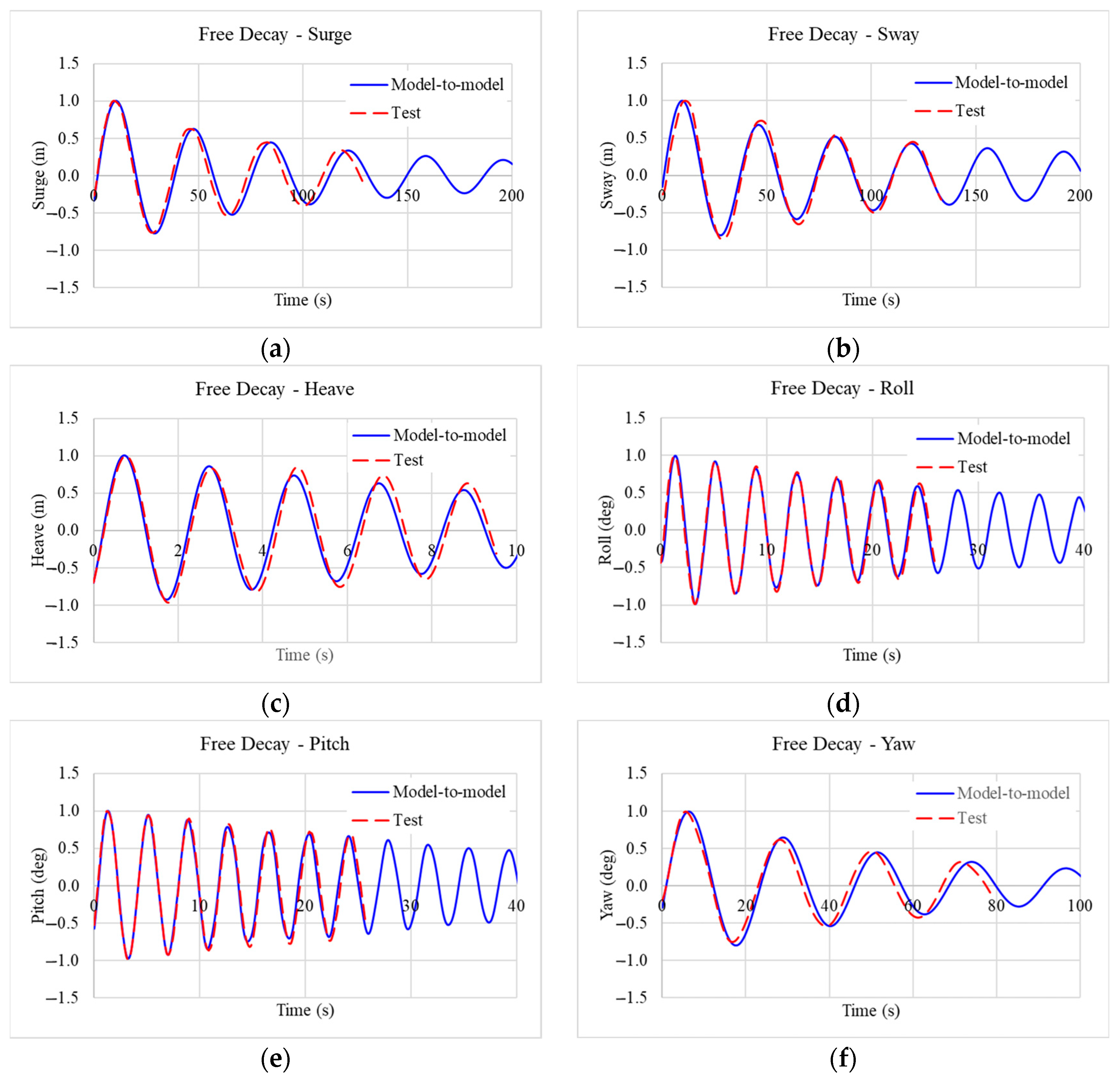 ®-TLP with OpenFAST simulations. Their results showed good agreement in natural frequencies (e.g., surge: 0.021 Hz experimental vs. 0.0213 Hz numerical; heave: 0.97 Hz experimental vs. 1.02 Hz numerical), emphasizing the need for calibrated damping matrices to account for viscous effects neglected in potential flow models. Similarly, studies like [