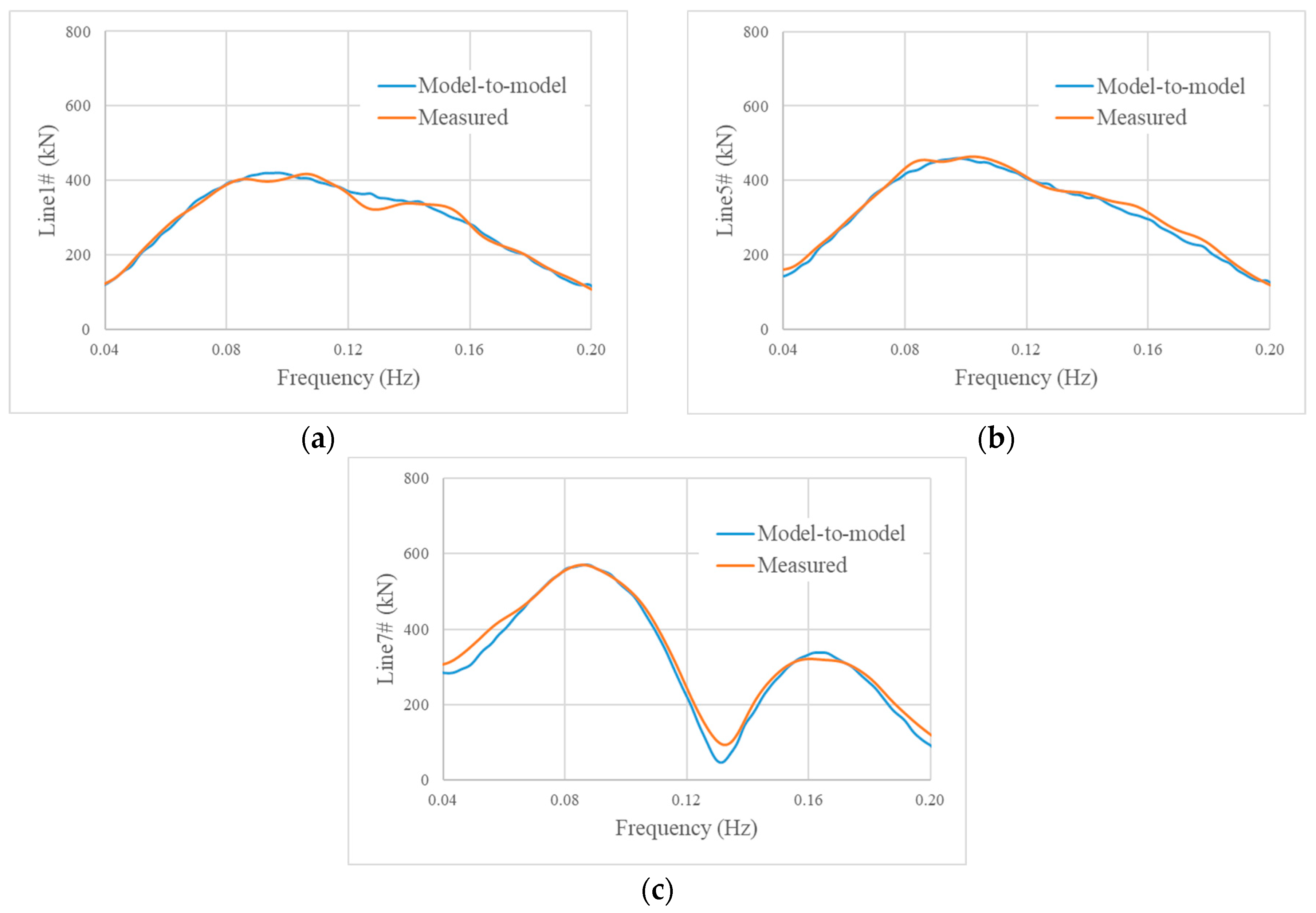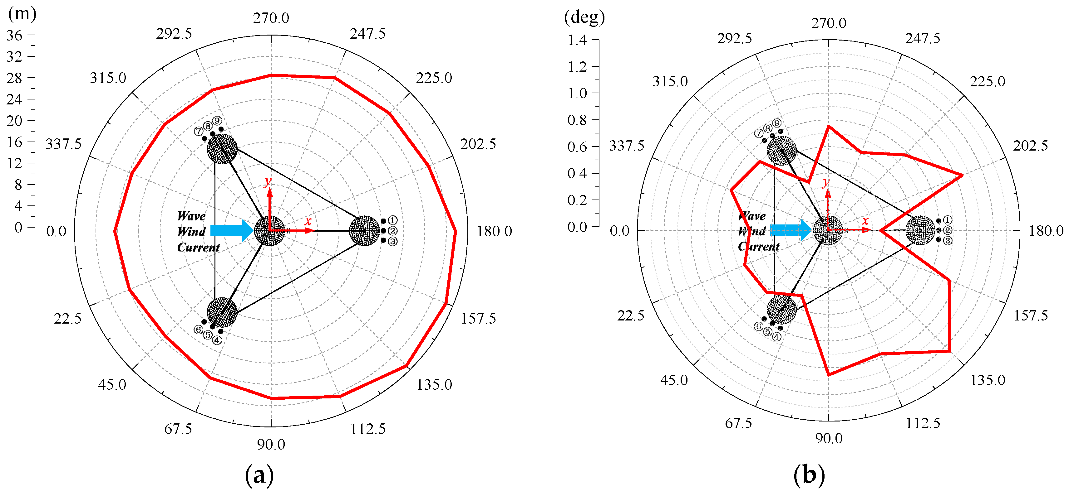 The mooring system demonstrates robust safety and fault tolerance across all scenarios. In DLC6.1 and DLC6.2, the calculated safety factors are 1.85 and 1.78, respectively, both exceeding the ABS-specified threshold of 1.75. Meanwhile, the minimum line base tension remains above zero, meaning there is no risk of mooring slack. Under DLC10.2, which simulates single mooring line breakage, load propagation is confined to moorings in the same group. Specifically, the tension variation of Line1 and Line3 reaches up to 56.49%, while the tension variation of moorings in other groups is no more than 2%. This result proves that the grouped mooring design effectively mitigates accidental failure risks.