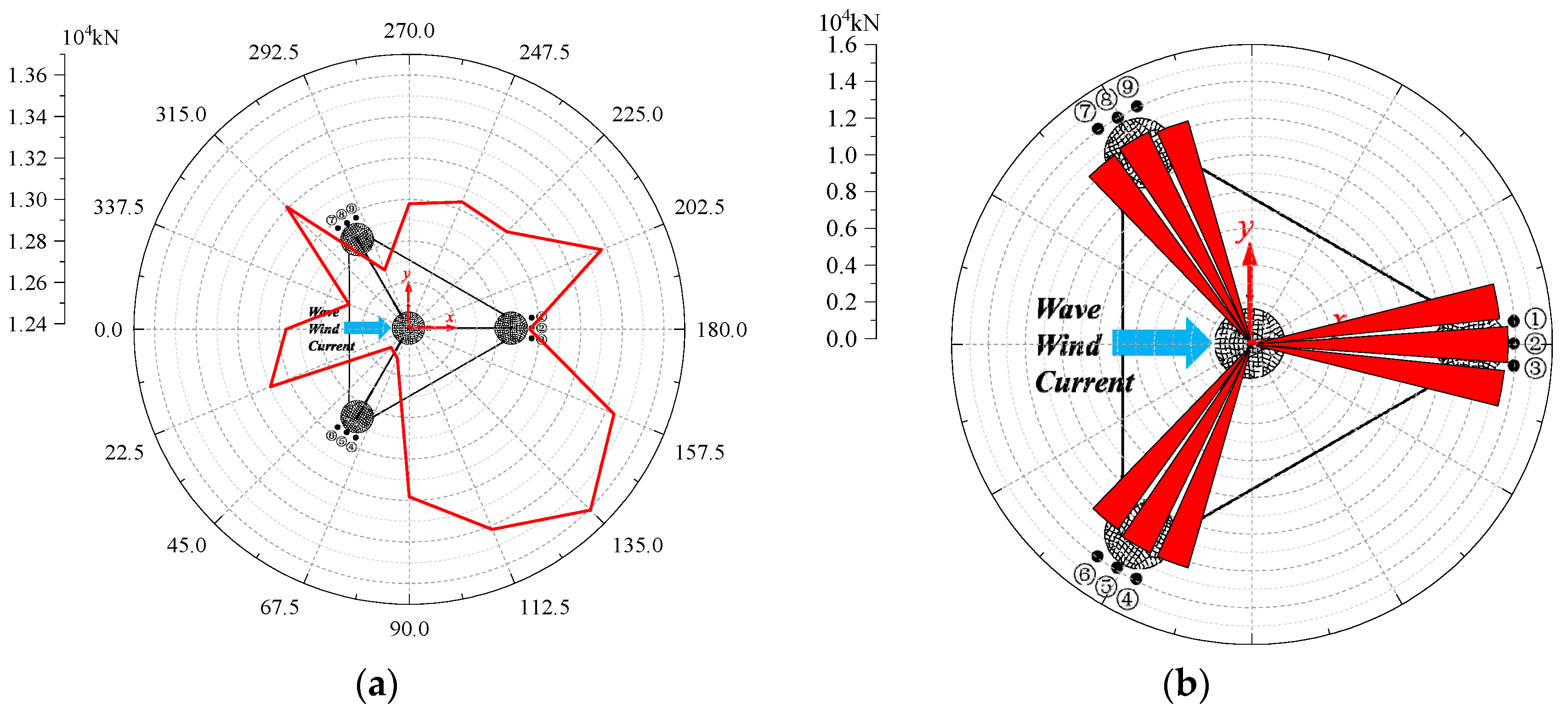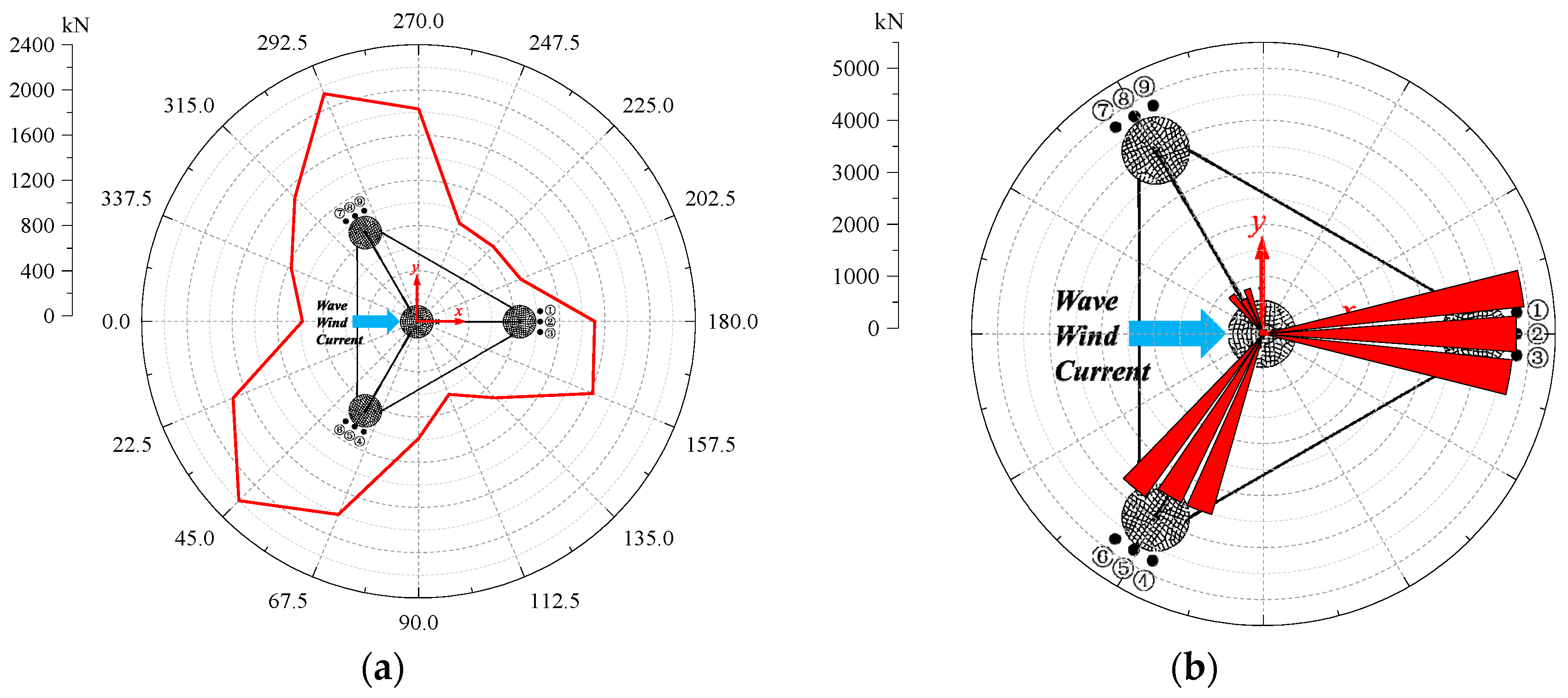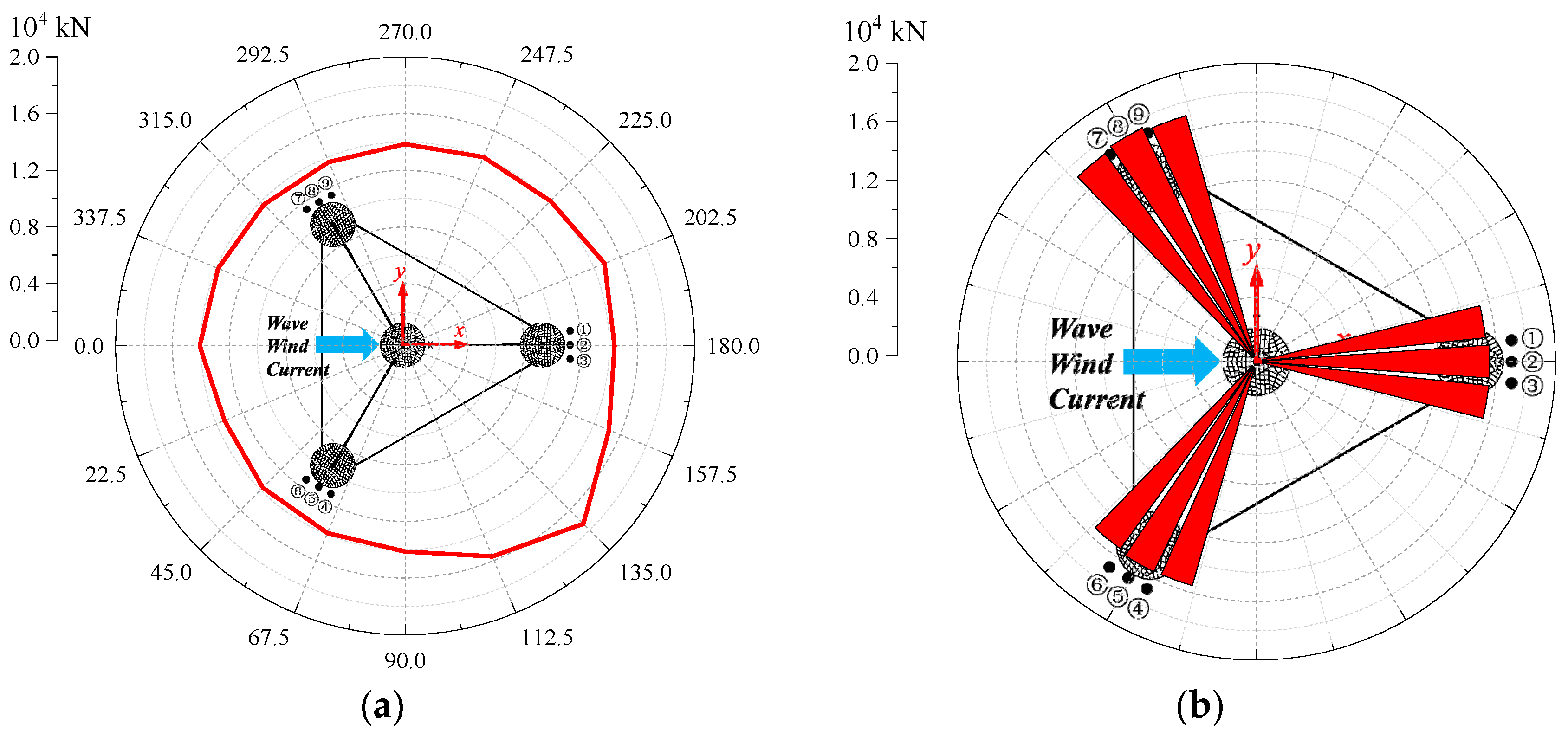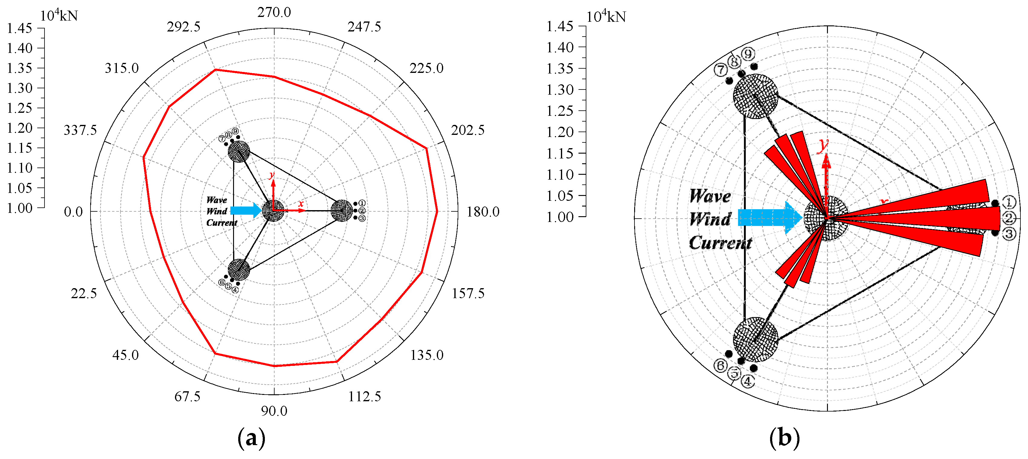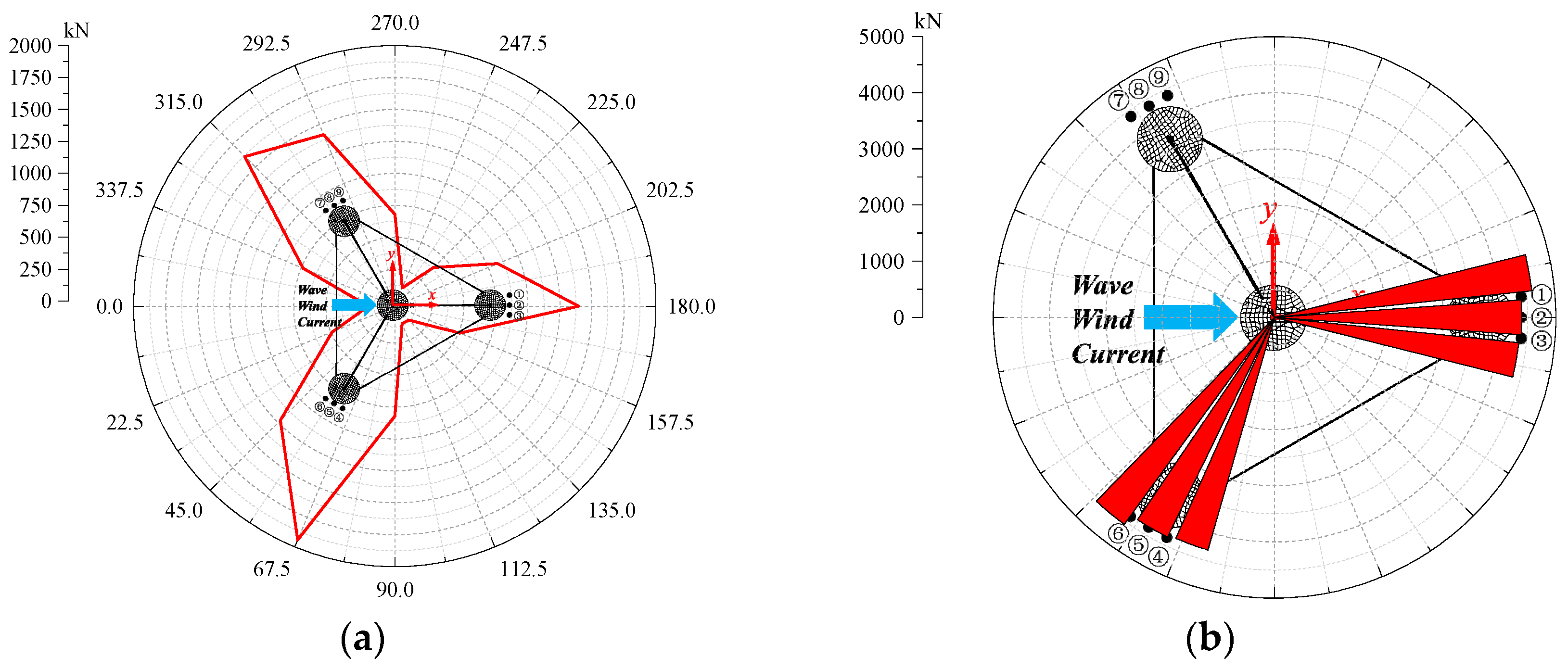 17] proposed a compact TLP with shortened tendons, showing that this design reduces tendon material costs by 25% while maintaining motion stability, expanding TLP applicability to shallower deep-water regions. Given that relevant research findings highlight the critical importance of tendon failure conditions, this study also incorporates tendon failure scenarios in the analysis of the TLP’s performance under extreme environments.