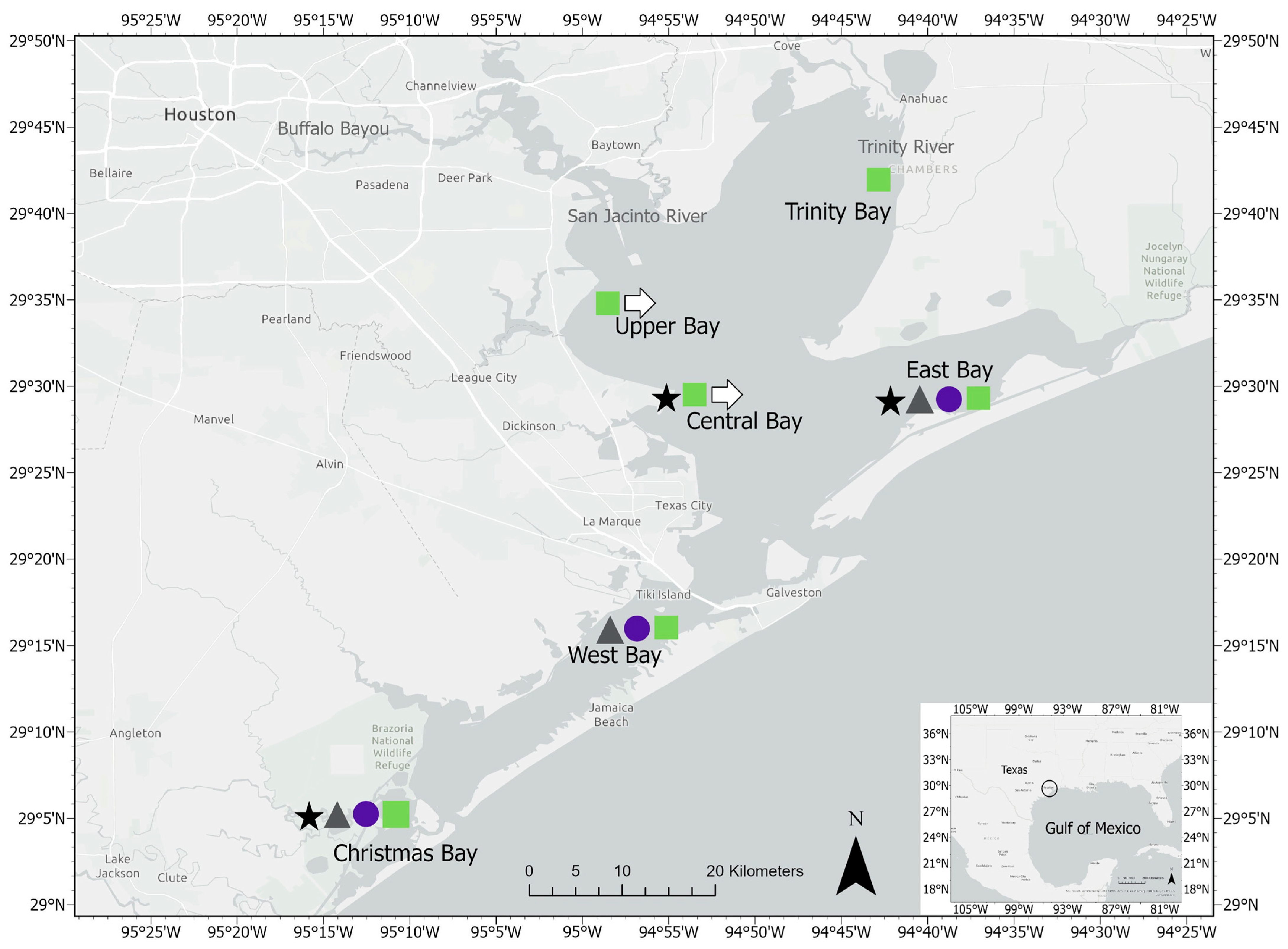 - Hanke, M.H.; Hackney, A.; Heath, S.A. Intertidal oyster reef mapping and population analysis in west Galveston Bay, Texas. Ecologies 2025, 6, 36. [Google Scholar] [CrossRef]