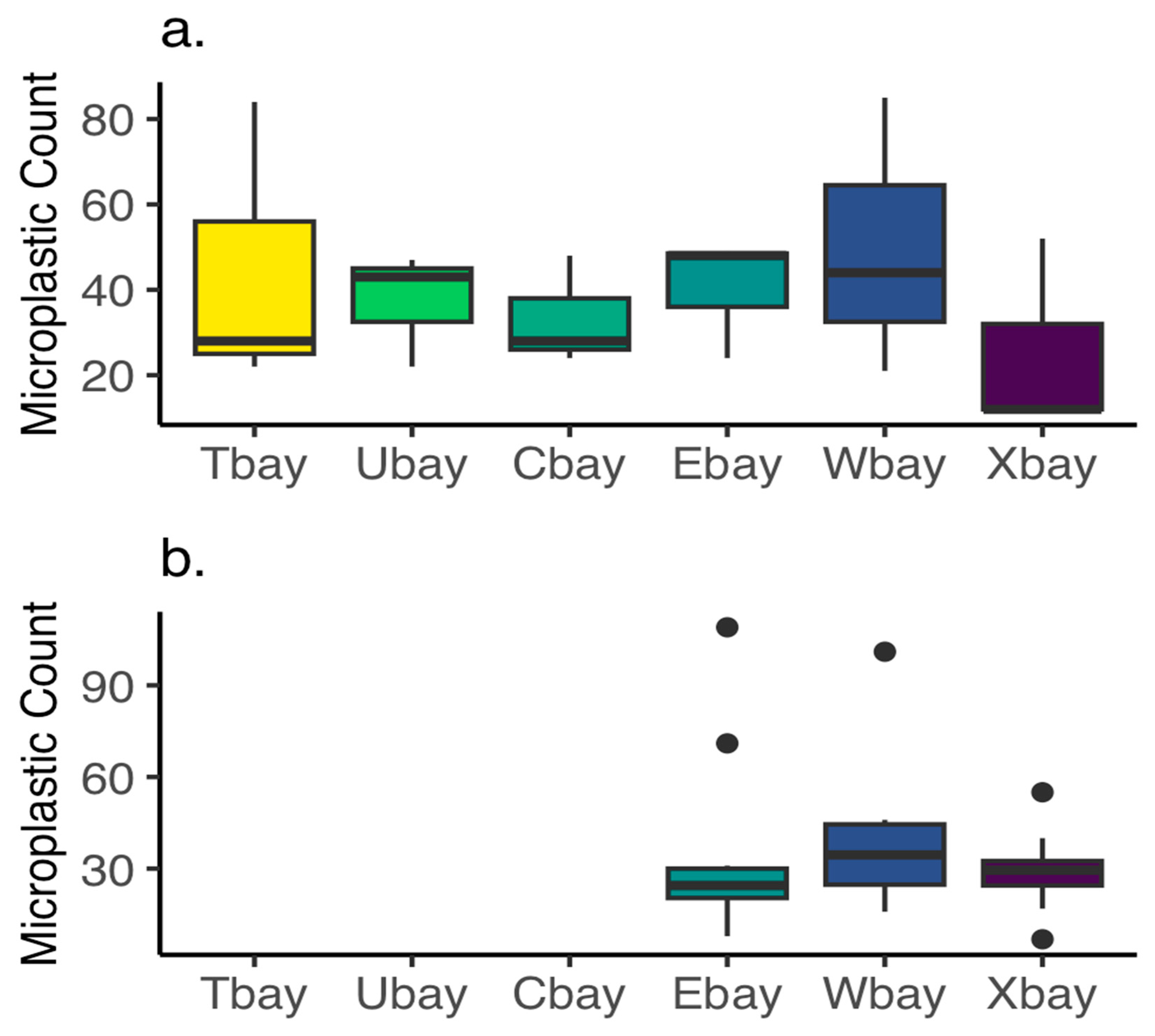 - Covernton, G.A.; Collicutt, B.; Gurney-Smith, H.J.; Pearce, C.M.; Dower, J.F.; Ross, P.S.; Dudas, S.E. Microplastics in bivalves and their habitat in relation to shellfish aquaculture proximity in coastal British Columbia, Canada. Aquac. Environ. Interact. 2019, 11, 357–374. [Google Scholar] [CrossRef]