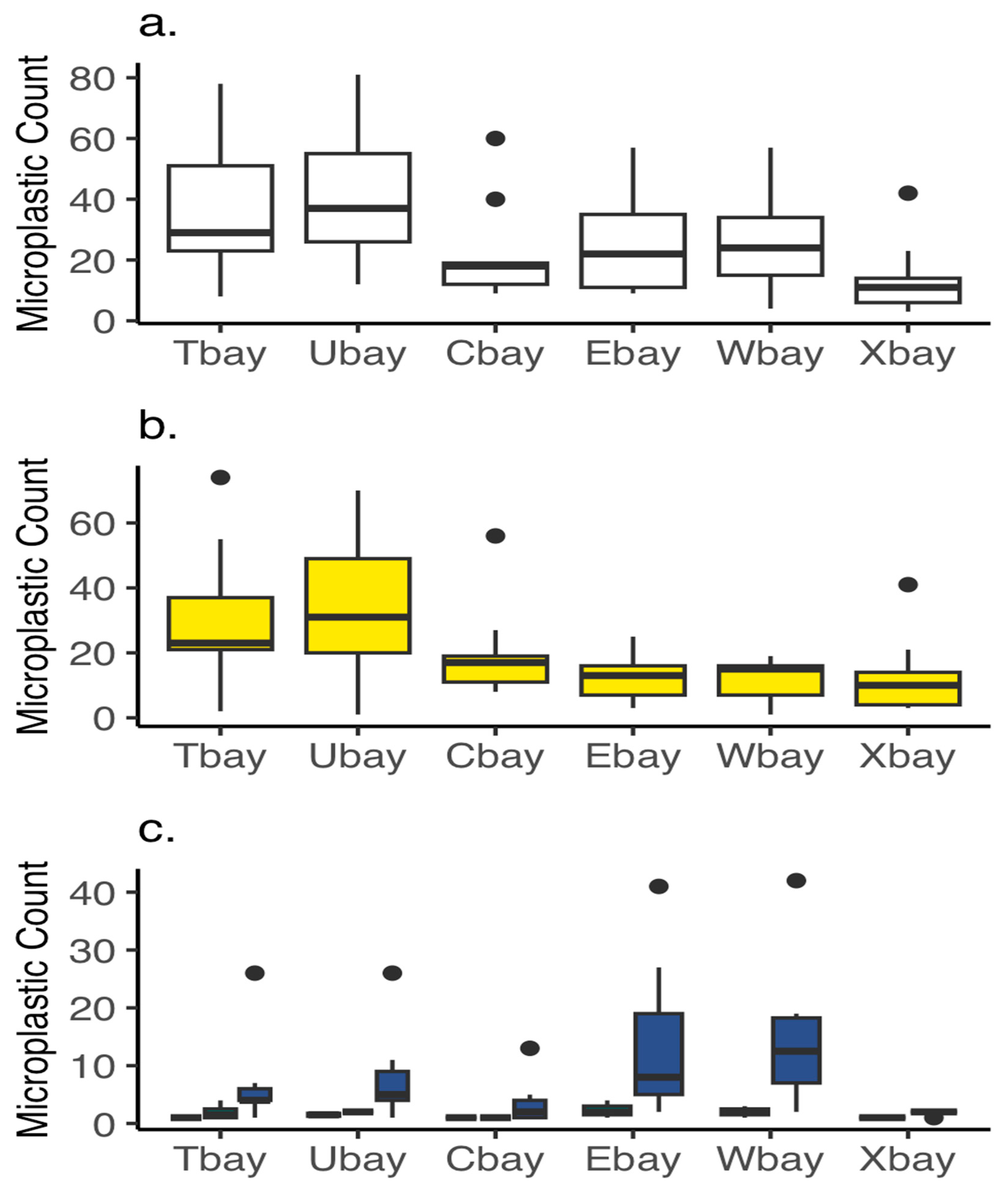 - Cisco, J.; Jiang, X.; Urias-Quiroz, J.A.; Lu, K.; Xue, J.; Liu, Z. Occurrence, Distribution and Composition of Microplastics in Bays and Estuaries of the Texas Coastal Bend; Report for the Coastal Bend Bays and Estuaries Program; 2025; p. 31. Report prepared by University of Texas Marine Science Institute, TX, USA. Available online: https://www.cbbep.org/manager/wp-content/uploads/2431_FinalReport-1.pdf (accessed on 2 April 2025).