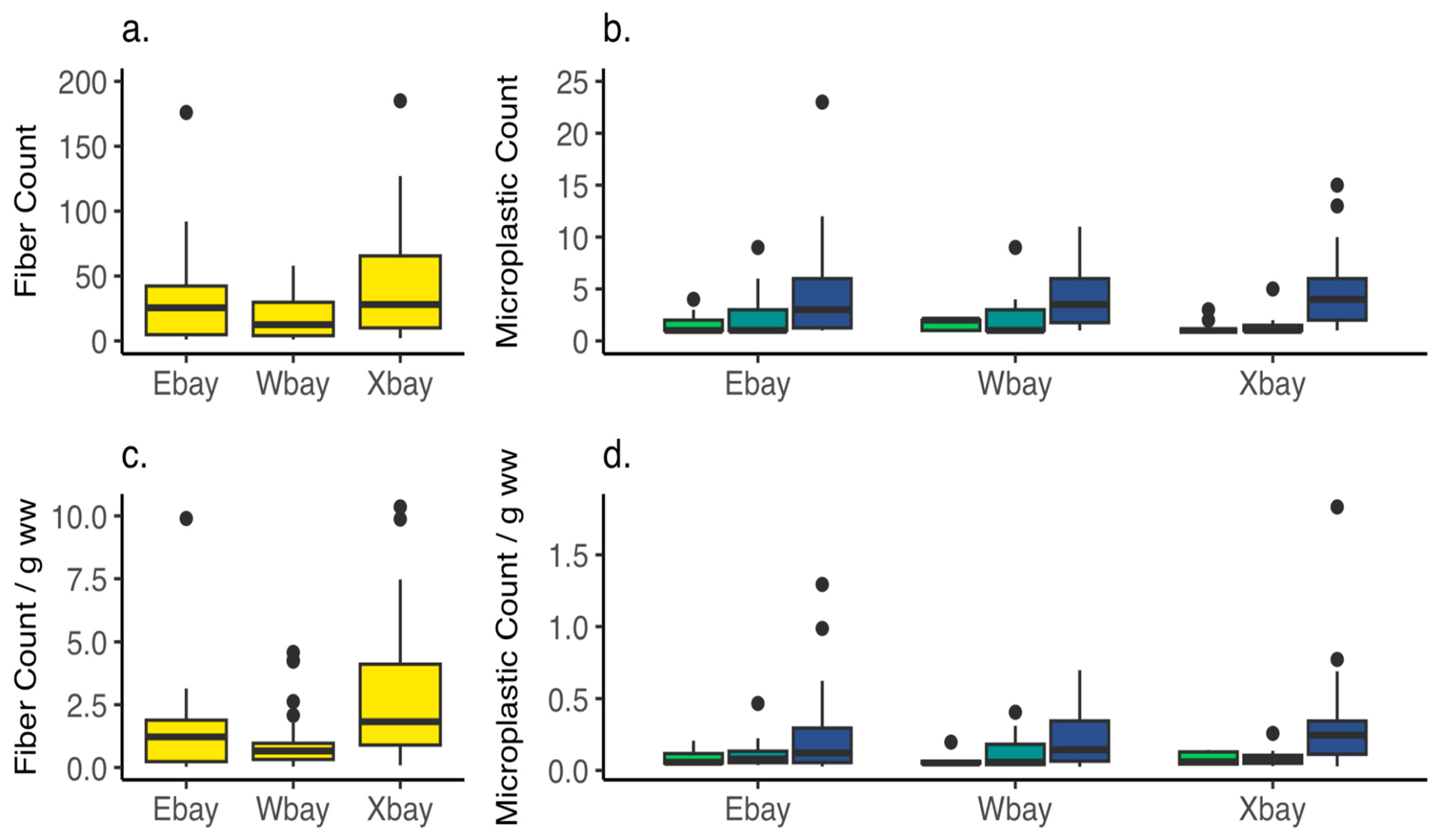 - Keisling, C.; Harris, R.D.; Blaze, J.; Coffin, J.; Byers, J.E. Low concentrations and low spatial variability of marine microplastics in oysters (Crassostrea virginica) in a rural Georgia estuary. Mar. Pollut. Bull. 2020, 150, 110672. [Google Scholar] [CrossRef]