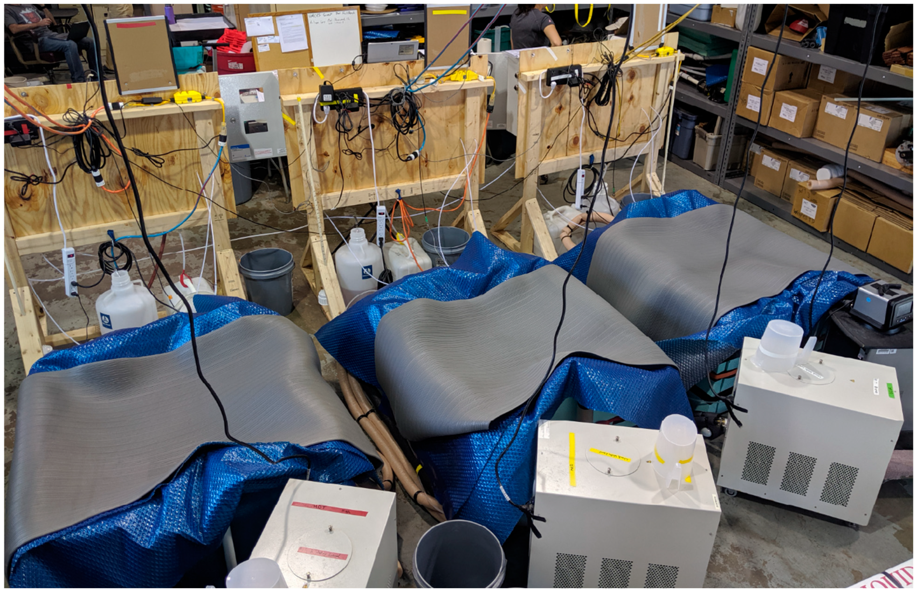 For trials measuring accuracy, we set water temperatures to be cold (7–10 °C), moderate (15–18 °C), or warm (24–27 °C). Recirculating chillers (e.g., Figure 1) maintained set water temperatures throughout day-long or partial-day trials. Insulation helped reach and maintain set temperatures: Sides of each tank were covered with foam board insulation (2″ [~5 cm] thickness). Tubing used as part of the chiller and coil circuit was covered in foam insulation to minimize exchange with the atmosphere. Tops of the tanks with the exposed water surfaces were covered with sheets of flexible insulation, consisting of two layers of air-bubble plastic film draped with a 1 cm-thick vinyl foam mat. Additionally, laboratory windows were shaded to limit solar radiation and heating of the workspace. When not in active use, tanks were covered with air-bubble plastic film and covered by a heavy insulator sheet (See Figure 1). The chillers circulated DI water in a closed loop from the chiller reservoir through custom-manufactured, stainless steel, heat exchanger coils (visible in Figure 2A,B), then back to the chiller reservoir. The tank dedicated to water temperatures 7–10 °C contained two coils, one for each of two recirculating chillers. The other two tanks both used just one chiller and one coil each. Tanks were filled the evening before the tests to allow the water to equilibrate to its target temperature overnight. The number of chillers (and chiller capacity) and the insulation were sufficient to keep the water temperatures within the specified range during the day-long trials, even as outdoor, ambient temperatures increased throughout the day.