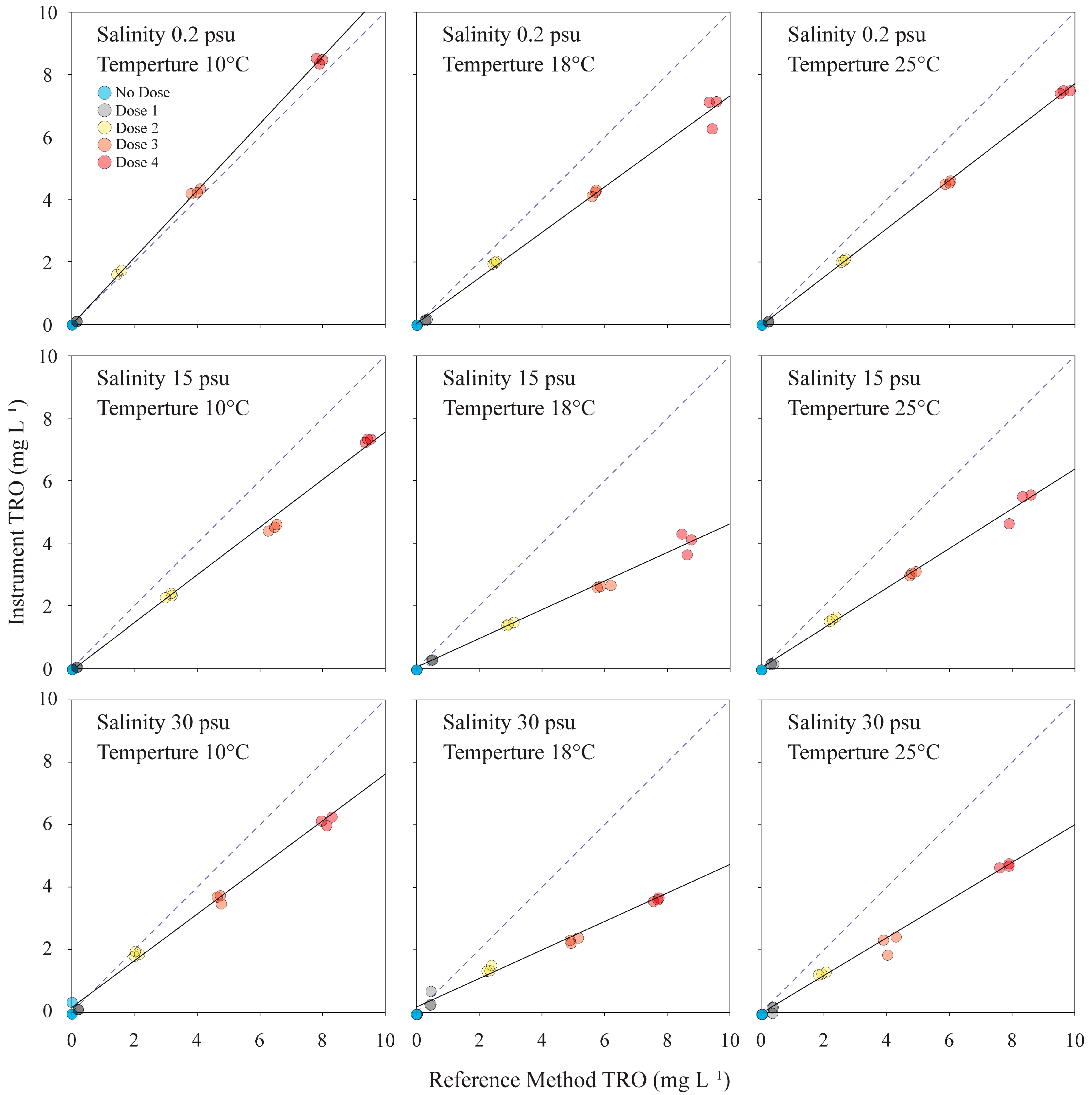 Figure 3. Example scatterplots from one of the TRO instruments evaluated (Instrument #3). This data represents the results of nine accuracy trials conducted at various water salinities and temperatures. Doses are color-coded, and a linear regression analysis generated the line-of-best-fit (solid line) describing the relationship between the reference method (X-axis) and the instrument tested (Y-axis). The dotted line shows a 1:1 relationship.