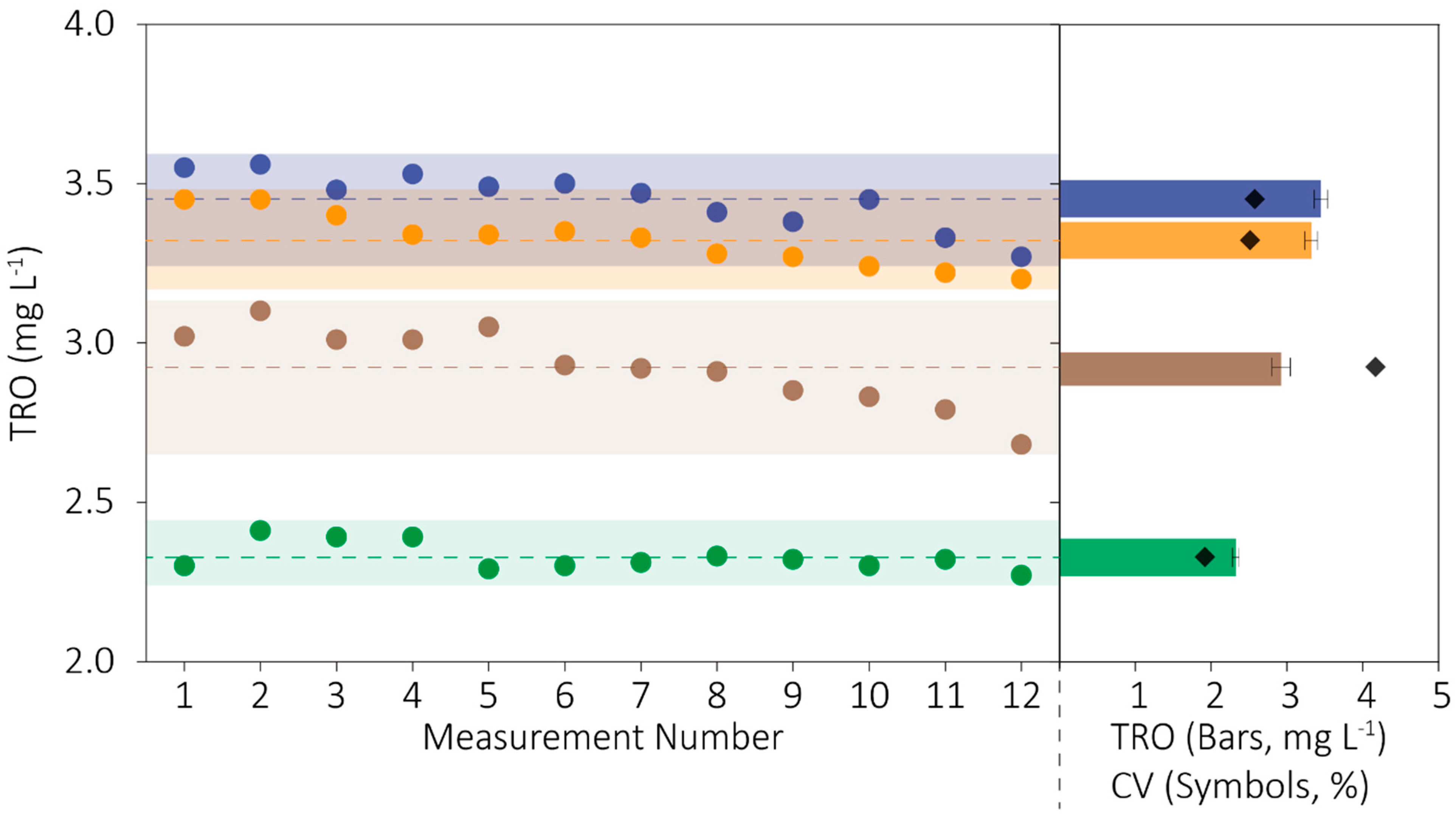 Figure 5. Precision of TRO instruments was measured as the coefficient of variation (CV) among 12 repeated measurements. Individual measurements are shown as symbols in the left panel, where a dotted line marks the mean values, and the shaded region encloses the range of values. In the right panel, bars show the mean value with standard deviations shown as error bars (the bars’ vertical position corresponds to the mean TRO from the y-axis on the left panel). Symbols on the right panel show CV (%), which ranged from 2 to 4% in these data sets, which are color-coded green, brown, and orange for instruments 1, 2, and 3, respectively. The reference method is shown with blue bars, lines, symbols, and shading.