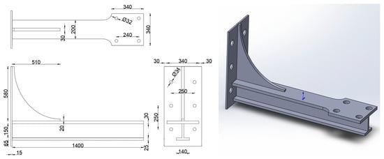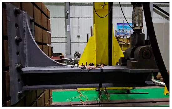 According to the above analysis, the fatigue test scheme for the joint was developed. In designing the test model, to ensure that the loading at the fatigue hotspot accurately reflects actual conditions, the plate thickness, material, geometry, welding configuration, and welding process at the hotspot and fatigue-affected regions were kept consistent with those of the real vessel, and the principal stress distribution at the hotspot was also matched to that of the actual ship. The test model was equivalently simplified under these constraints. The bracket and the upper plate adjacent to the bracket (corresponding to the deck in the actual vessel) were made of E550 steel, while the web and flange plates of the girder beneath the deck were made of EH36 steel. The model has the form of a “cantilever beam,” as shown in Figure 3.
