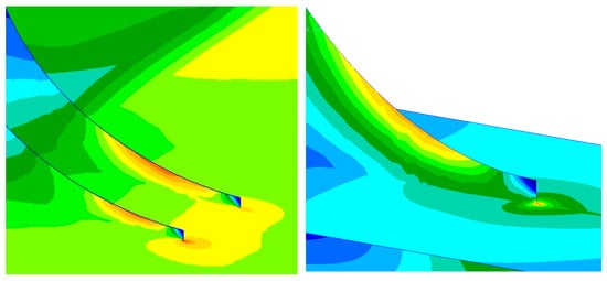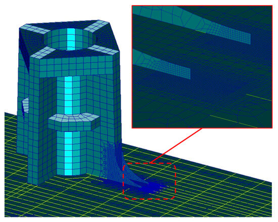 In accordance with commonly used fatigue design standards, such as DNV-RP-C203 and CCS [21,22], the following meshing rules were applied when refining the finite element model around the fatigue hotspots in this study. The mesh size at the hotspot was limited to not exceed the local plate thickness t. The refined mesh region was extended in all directions from the hotspot by at least 10t. A smooth transition in mesh density was maintained between the refined and coarse mesh regions. In the refined mesh area, four-node quadrilateral elements were employed, and the use of triangular elements was avoided as much as possible. The results of the mesh refinement are shown in Figure 10.