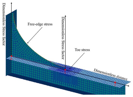 To verify the rationality of the fatigue specimen design for the typical joint, a comparative analysis of the stress distribution characteristics at the free edge and the toe hotspot of the bracket was conducted between the actual ship structure and the specimen, based on finite element analysis results. For the free-edge stress, dummy beam elements were created along the curved free edge of the bracket, and the axial stress distribution was obtained in their local coordinate system. For the toe stress, two rows of shell elements in the deck region perpendicular to the toe were selected, and the stresses at the centroid of each element were extracted. These were then interpolated pairwise to obtain the variation curve of the toe stress along the ship’s length.