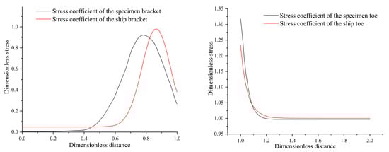 To verify the rationality of the test design, both the stresses and the element distances of the actual ship and the specimen were nondimensionalized, and their stress distribution characteristics were compared. Taking the connection between the bracket and the pile-support frame as the origin of the coordinate axis, the distances of both structures were divided by the bracket width to obtain the nondimensional distance. Under this definition, the nondimensional distance at the bracket toe is 1, and the nondimensional distance corresponding to twice the bracket width, representing the far-field stress, is 2, as illustrated in Figure 5.