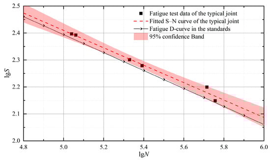 By substituting the fatigue test data listed in Table 4 into Equations (9) and (10), the S–N curve for the bracket toe weld of the typical joint can be obtained, with its expression given in the form of Equation (11).