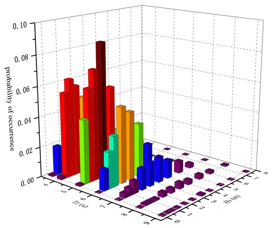 The significant wave height is a key factor affecting the strength of ship structures. Fatigue damage is not only related to the significant wave height Hs, but also to the zero-crossing period Tz, the probability of different sea states, and other factors. Therefore, fatigue damage is highly sensitive to scatter diagrams. Considering the ship operating area, wave scatter data from the coastal regions of China were selected for calculating the structural stress response transfer function [9]. The probability distribution of waves under different periods and wave heights is shown in Figure 11.