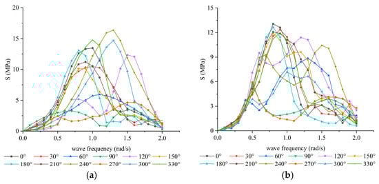 In Patran 2019, the water pressure was applied, and the inertia release method was used to calculate the structural response. After obtaining the stress response distribution of the structure, the interpolation method described in Equation (5) and illustrated in Figure 8 was employed to derive the stress response at the hotspot. Consequently, the stress response transfer functions under different wave directions and frequencies were obtained, as shown in Figure 12.