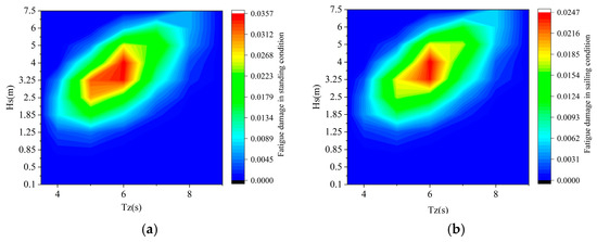 The distribution of fatigue damage varies significantly across different sea states. Under the Standing condition, the most severe fatigue damage occurs in a sea state with a wave height of 3.25 m and a wave period of 6 s. Similarly, under the Sailing condition, the maximum fatigue damage is observed in a sea state with the same wave height of 3.25 m and wave period of 6 s. This indicates that the combination of these particular wave characteristics contributes most significantly to fatigue damage in both conditions. The specific values of fatigue damage under these sea states are presented in Figure 13, providing a clearer comparison of the damage distribution in different operational conditions.