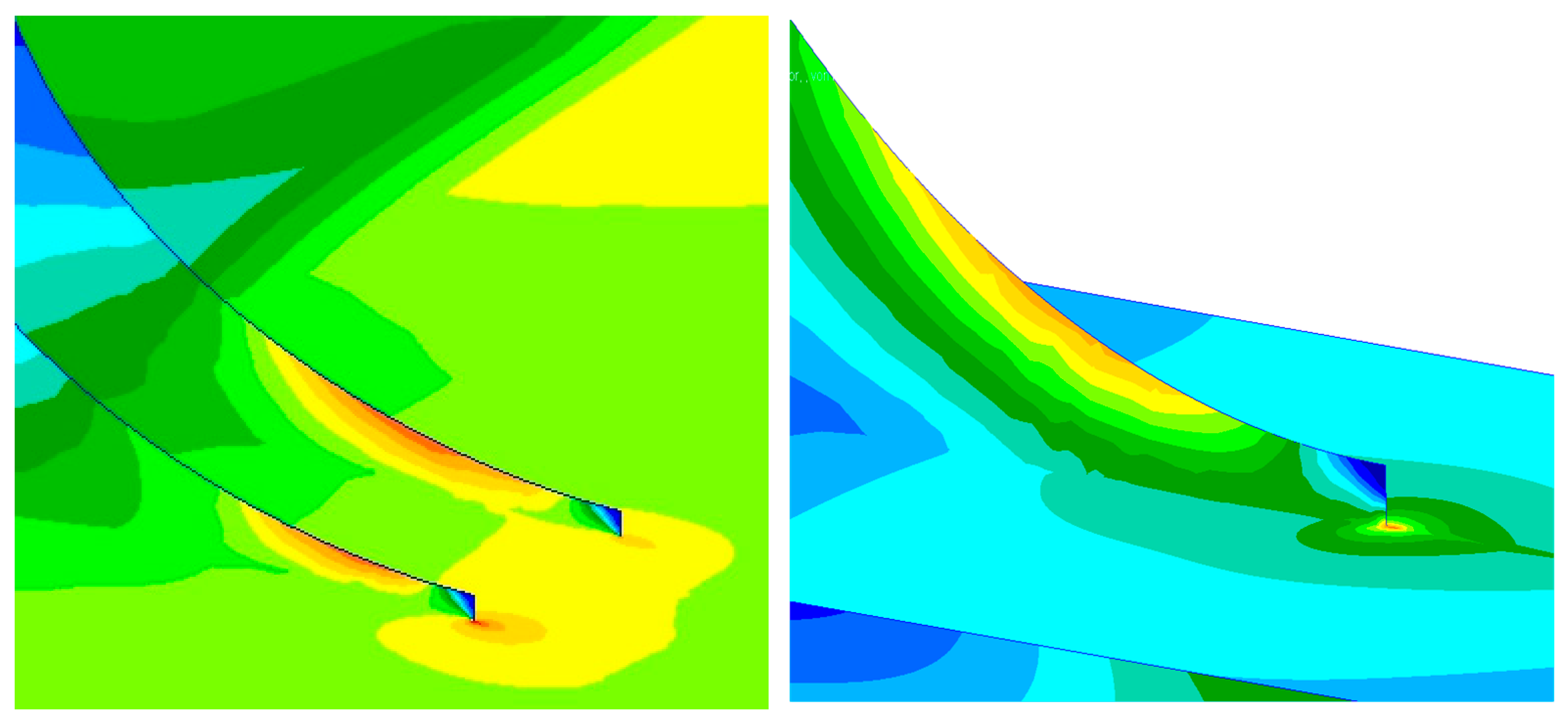 22], the following meshing rules were applied when refining the finite element model around the fatigue hotspots in this study. The mesh size at the hotspot was limited to not exceed the local plate thickness t. The refined mesh region was extended in all directions from the hotspot by at least 10t. A smooth transition in mesh density was maintained between the refined and coarse mesh regions. In the refined mesh area, four-node quadrilateral elements were employed, and the use of triangular elements was avoided as much as possible. The results of the mesh refinement are shown in