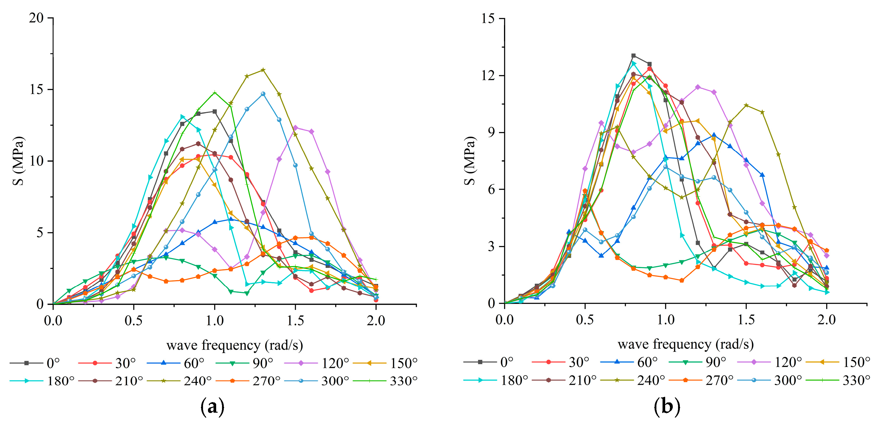 Figure 8 was employed to derive the stress response at the hotspot. Consequently, the stress response transfer functions under different wave directions and frequencies were obtained, as shown in