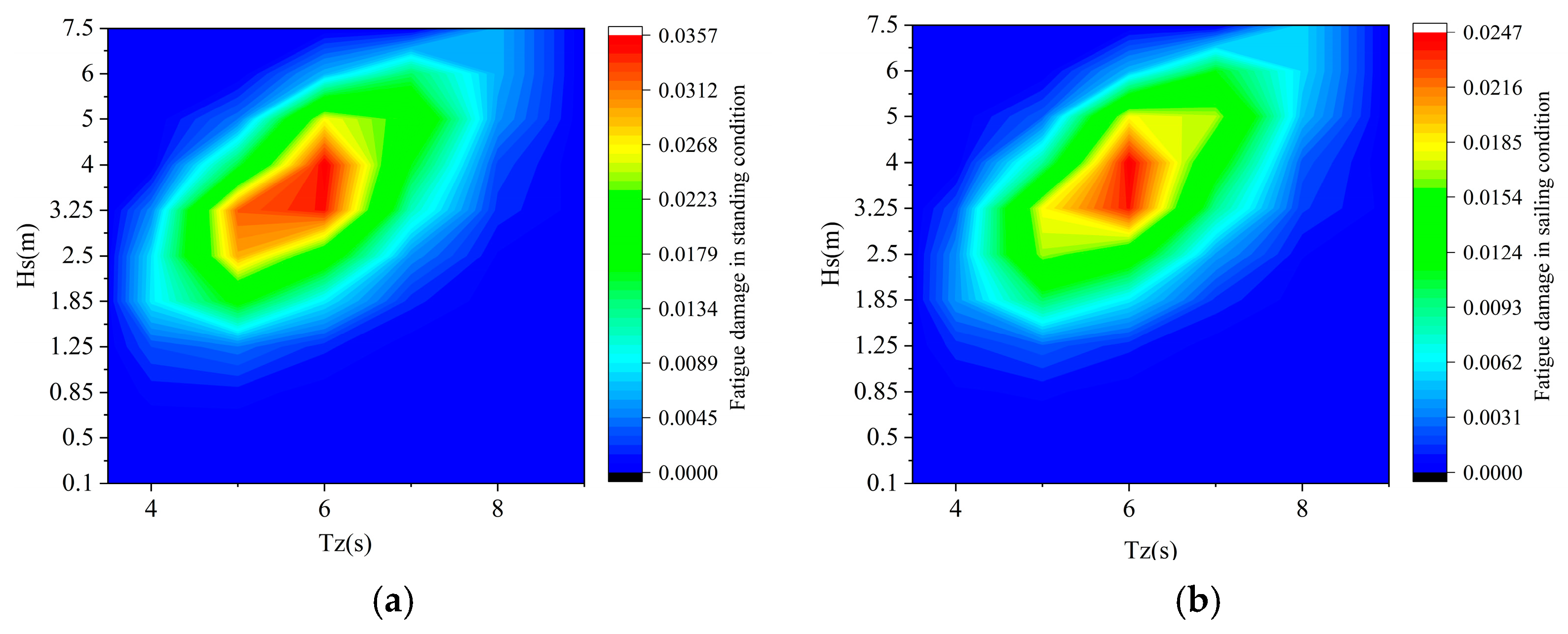 The distribution of fatigue damage across different wave headings varies significantly depending on the operating condition. Under the Standing condition, the most severe fatigue damage occurs at a wave heading of 240°, corresponding to oblique waves. Similarly, for the Sailing condition, the maximum fatigue damage is observed at a wave heading of 210°, also associated with oblique waves. This directional dependence highlights the importance of considering wave orientation in fatigue analysis. The specific values of the fatigue damage for each condition are presented in