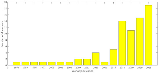 In addition to document type, the publications were also grouped based on their year of publication. The dataset spans from 1974 to 2021, reflecting the growing interest in autonomous ships, particularly over the last two decades. As illustrated in Figure 2, the number of publications remained relatively low (fewer than 10 documents) during the periods 1974–1997, 2003–2009, and 2013–2016. However, a sharp increase occurred between 2017 and 2021, during which 64 papers were published, indicating a surge in research activity in this field.