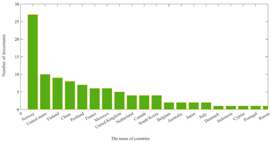 Figure 5 presents the bibliographic coupling analysis of organizations, including 46 institutions grouped into seven distinct clusters. For each organization, the number of publications, total citations, and total link strength are provided. The Department of Marine Technology in Norway stands out as the most influential organization in this field, with 2 publications, 77 citations, and a total link strength of 254. It is followed by the Department of Marine Technology at the Norwegian University of Science and Technology (NTNU), also in Norway, with 2 publications, 32 citations, and a link strength of 169. Other notable organizations include the University of California (1 publication; 13 citations; link strength 117), the Korea Research Institute of Ships and Ocean Engineering (1; 1; 139), and the Department of Mechanical and Electrical Engineering in Denmark (1; 11; 89).