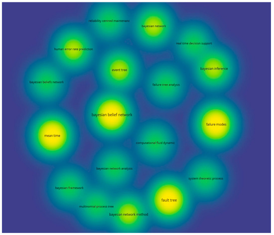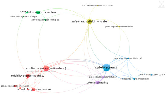 Table 4 presents the total link strength of each keyword based on co-occurrence analysis. The most frequently occurring keyword is “autonomous ship”, which appears 21 times and has a total link strength of 93. This is followed by “reliability” (9 occurrences; 48 link strength), “marine vehicles” (2; 24), “safety” (3; 20), “reliability engineering” (3; 19), “Bayesian networks” (3; 18), “collision risk” (3; 18), “conventional ship” (3; 18), “navigation” (2; 16), “autonomous systems” (3; 15), and “fault tree analysis” (2; 14). Different colors in Figure 12 represent different keyword clusters. In total, 18 clusters are identified, indicating thematic groupings based on keyword co-occurrence relationships.