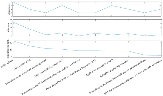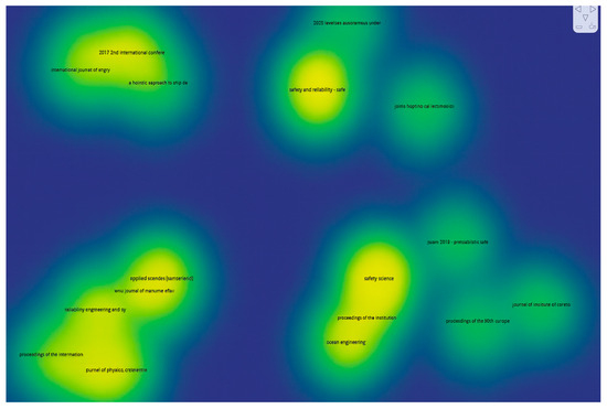 Density visualization of sources by bibliographic coupling depicts the connections among research sources according to the references they have in common. Figure 6 presents the bibliographic coupling of the sources, focusing on the number of documents published. Figure 7 and Figure 8 provide density visualizations based on bibliographic coupling data. To evaluate the importance of each journal, three key metrics were considered: the number of publications, the number of citations, and the total link strength. Among these, the number of publications is regarded as the most significant indicator, followed by citations and then total link strength. Safety Science stands out as the most influential source, with 4 publications, 169 citations, and a total link strength of 45. Other notable sources include Ocean Engineering (2 publications; 84 citations; link strength 31), PSAM 2018 Probabilistic Safety (1; 14; 24), Safety and Reliability—Safe Society (3; 36; 22), Proceedings of the 30th European (1; 0; 18), Proceedings of the Institute of (1; 32; 18), Applied Sciences Switzerland (3; 12; 17), Reliability Engineering and System Safety (2; 28; 17), Proceedings of the International (1; 0; 6), and 2017 2nd International Conference (2; 14; 5).