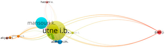 Figure 13 and Table 5 present a detailed citation analysis of the most influential authors in the field, highlighting their publication output, citation counts, and total link strength. Among the authors, Utne I.B. stands out as the most prolific and influential, with 11 publications, 269 citations, and a total link strength of 21. This indicates a strong research presence and significant impact within the academic community. Mansouri K. and Youssfi M. both have 6 publications and 22 citations each, with total link strengths of 20, showing consistent but comparatively moderate influence. Interestingly, Mosleh A. has fewer publications (5) but a notably higher citation count (134), suggesting that their work is highly regarded and frequently referenced despite a smaller publication volume.