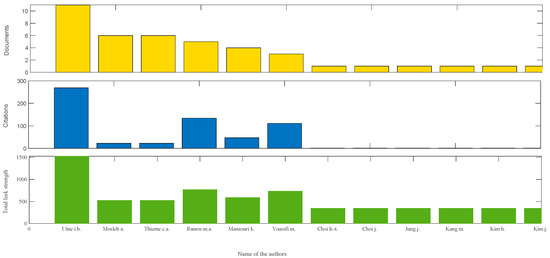 Figure 10 shows the bibliographic coupling analysis of authors, and Figure 11 compares authors by publications, citations, and link strength. The most influential author is Utne, I.B., with 11 publications, 269 citations, and a total link strength of 1525. The second most influential is Mosleh, A., who has 5 publications, 134 citations, and a total link strength of 768. Although Mansouri, K. has more publications (6), the lower citation count (22) and link strength (523) place him behind Mosleh in overall impact. Other notable authors include: Thieme, C.A. (3 publications; 111 citations; 734 link strength), Ramos, M.A. (4; 47; 589), Youssfi, M. (6; 22; 523), Choi, H.-T. (1; 1; 345), Choi, J. (1; 1; 345), Jung, J. (1; 1; 345), Kang, M. (1; 1; 345), Kim, H. (1; 1; 345).These results indicate that although some authors have fewer publications, they may still exhibit significant influence through strong citation counts and high link strength.