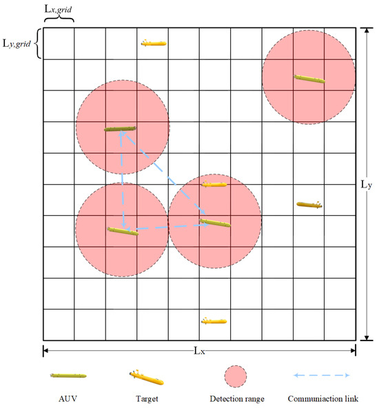 Let denote the multi-AUV cluster system, where , and is the number of individuals. The position of the AUV at time step is denoted by , and the corresponding grid area coordinate is . The detection radius of each AUV is . The detection area of the AUV is defined as follows: