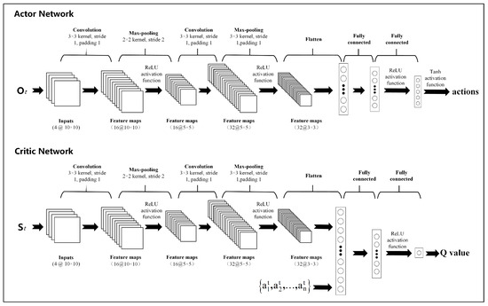 In the proposed architecture, both the actor and critic networks adopt identical CNN encoder configurations. The first convolutional layer contains 16 filters with a kernel size of , a stride of 1, and a padding of 1, followed by a max-pooling layer with a kernel size of and a stride of 2. The second convolutional layer employs 32 filters with the same kernel, stride, and padding settings, followed by a max-pooling layer with a kernel size of , a stride of 1, and a padding of 1; this is followed by a max-pooling layer with a kernel size of and a stride of 1. The resulting feature maps are flattened and fed into two fully connected layers, each with 64 hidden units. All hidden layers in both networks use the ReLU activation function, while the output layer of the actor network applies the tanh activation function to generate continuous actions. This design ensures consistent spatial feature extraction between the actor and critic networks while adhering to the CTDE architecture. Consequently, it enhances the model’s ability to represent complex spatial structures and improves cooperative decision-making performance in multi-agent environments. The overall architectures of the actor and critic networks are illustrated in Figure 3.