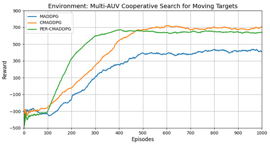 This section compares the performance of the MADDPG, convolutional multi-agent deep deterministic policy gradient (CMADDPG), and PER-CMADDPG methods. Figure 5 illustrates the reward curves of different methods. The results shown in Figure 5 are obtained from a multi-AUV cooperative search for the moving target mission, in which six AUVs are used for detecting six moving targets within a 1000 m × 1000 m mission area. The speed of the AUV and the moving target is set to 2 m/s. The sonar detection radius is set to 200 m, and the communication radius is set to 500 m.