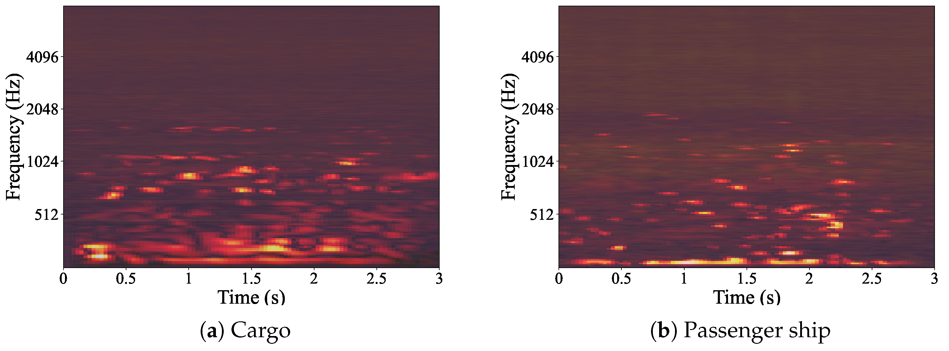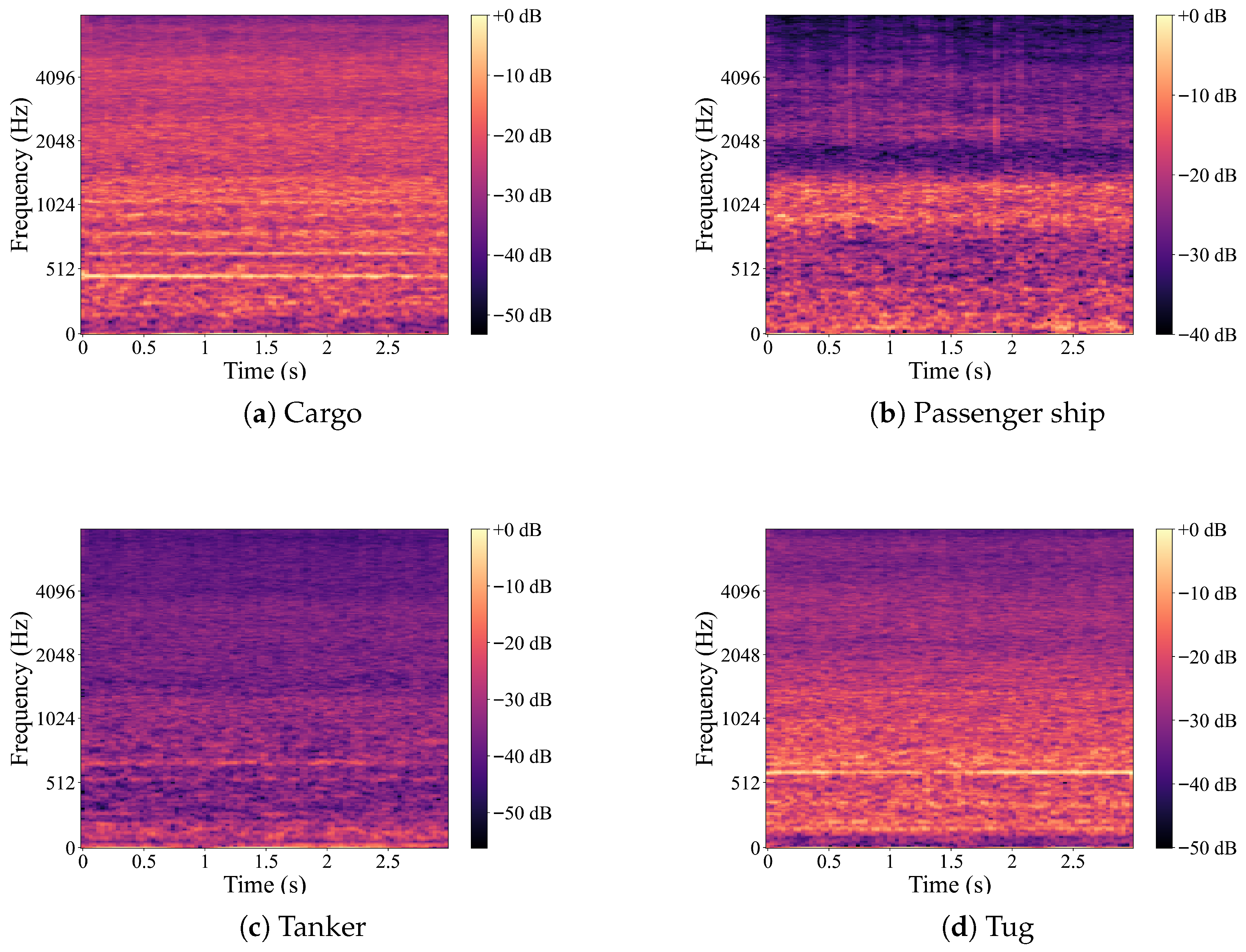 - Hu, F.; Fan, J.; Kong, Y.; Zhang, L.; Guan, X.; Yu, Y. A Deep Learning Method for Ship-Radiated Noise Recognition Based on MFCC Feature. In Proceedings of the 7th International Conference on Transportation Information and Safety (ICTIS), Xi’an, China, 4–6 August 2023; pp. 1328–1335. [Google Scholar] [CrossRef]