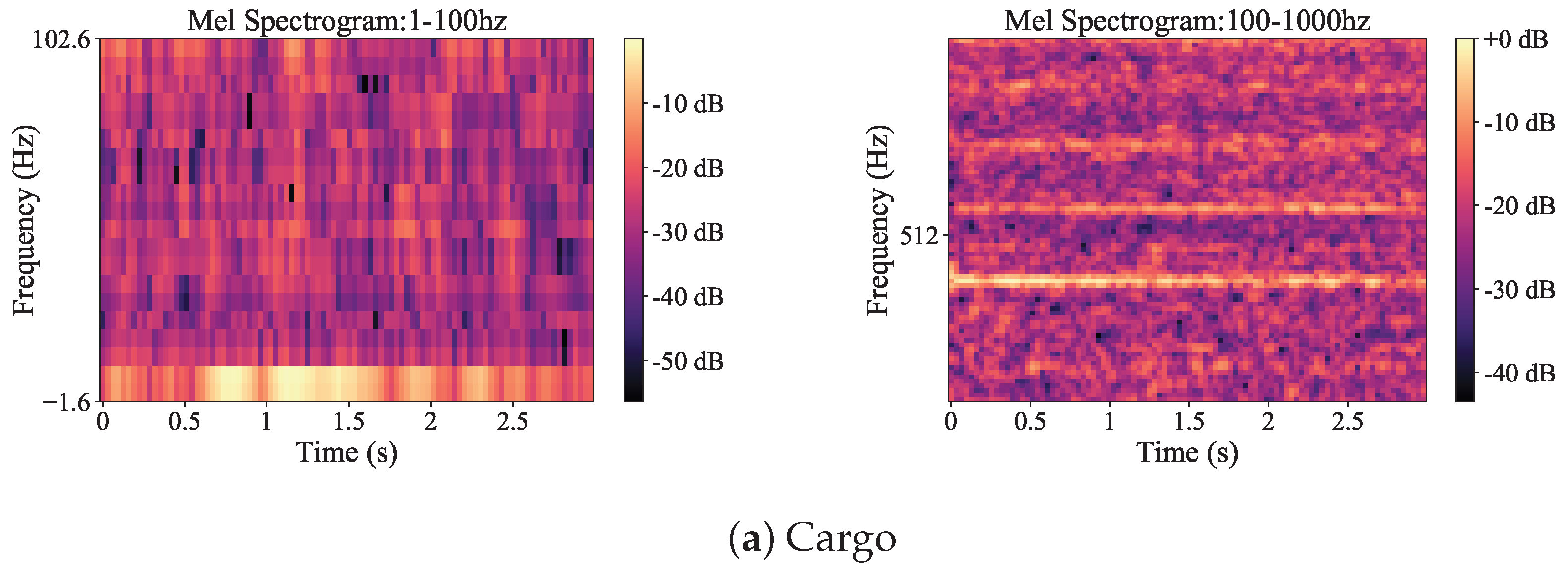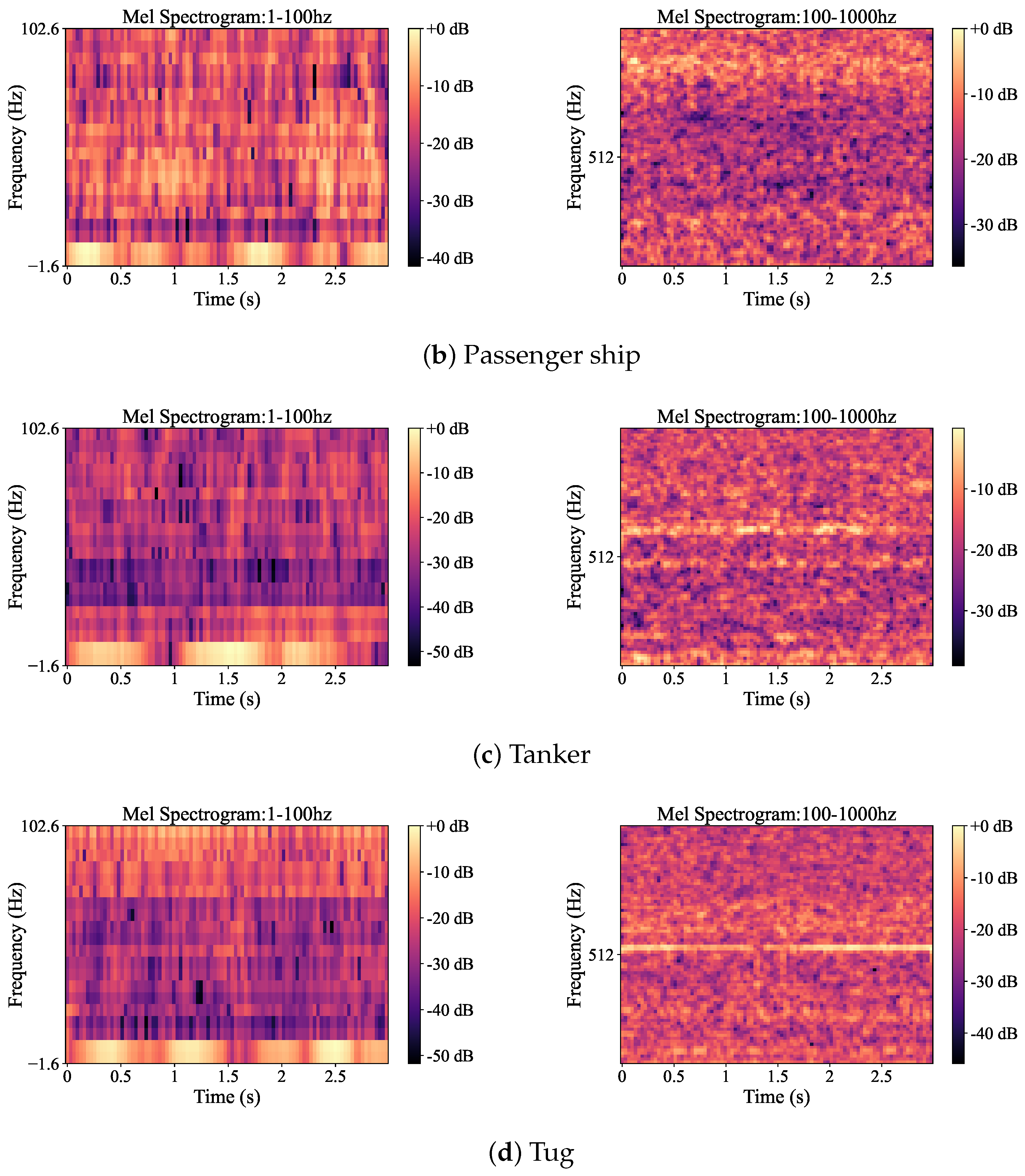 - Yang, S.; Jin, A.; Zeng, X.; Wang, H.; Hong, X.; Lei, M. Underwater acoustic target recognition based on sub-band concatenated Mel spectrogram and multidomain attention mechanism. Eng. Appl. Artif. Intell. 2024, 133, 107983. [Google Scholar] [CrossRef]
