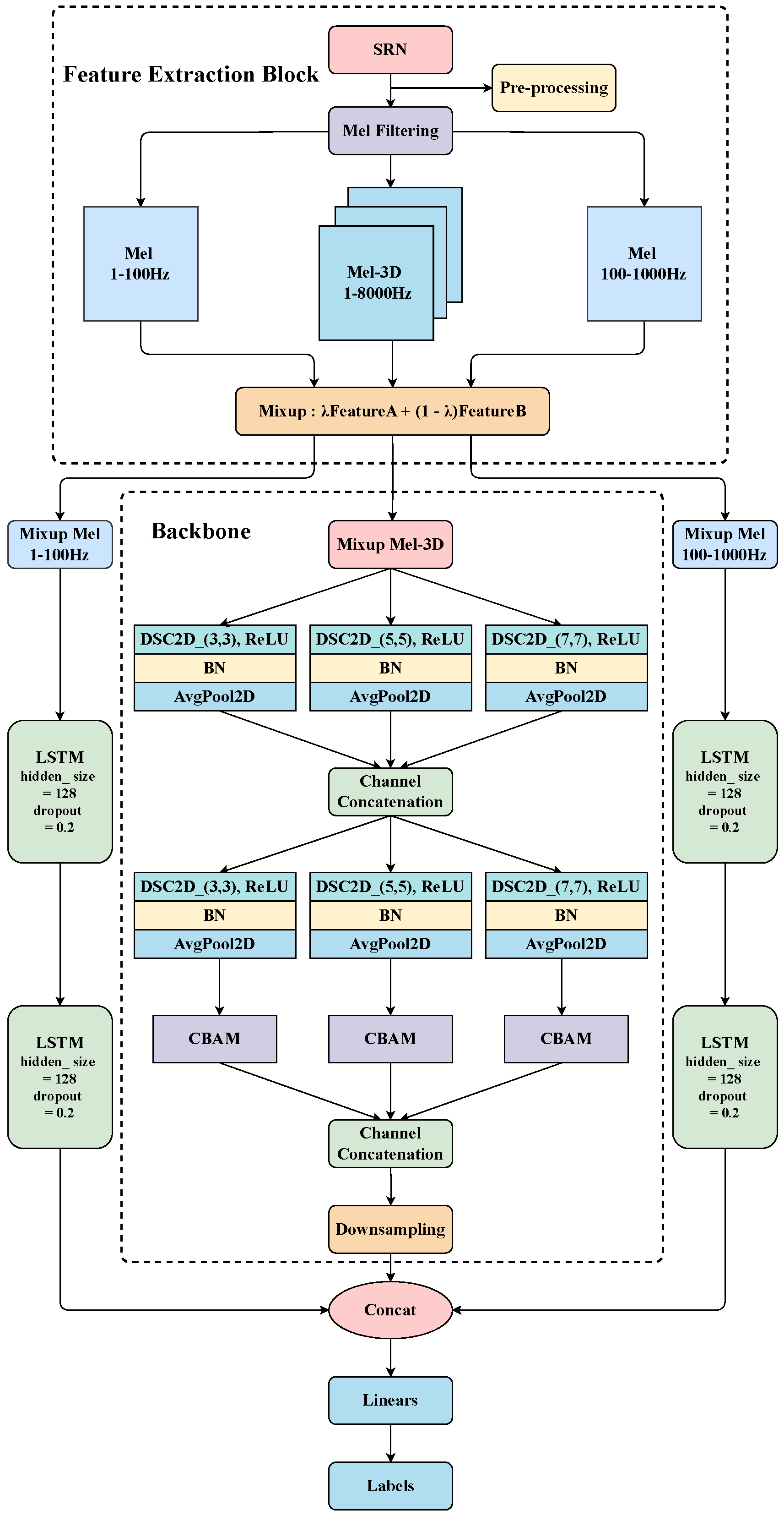 - We introduce two LSTM-based temporal modules to effectively incorporate low-frequency temporal features (LFTF) into the model. This approach enhances the model’s performance by capturing temporal dependencies in spectrograms, with only a slight increase in computational cost and parameter count.