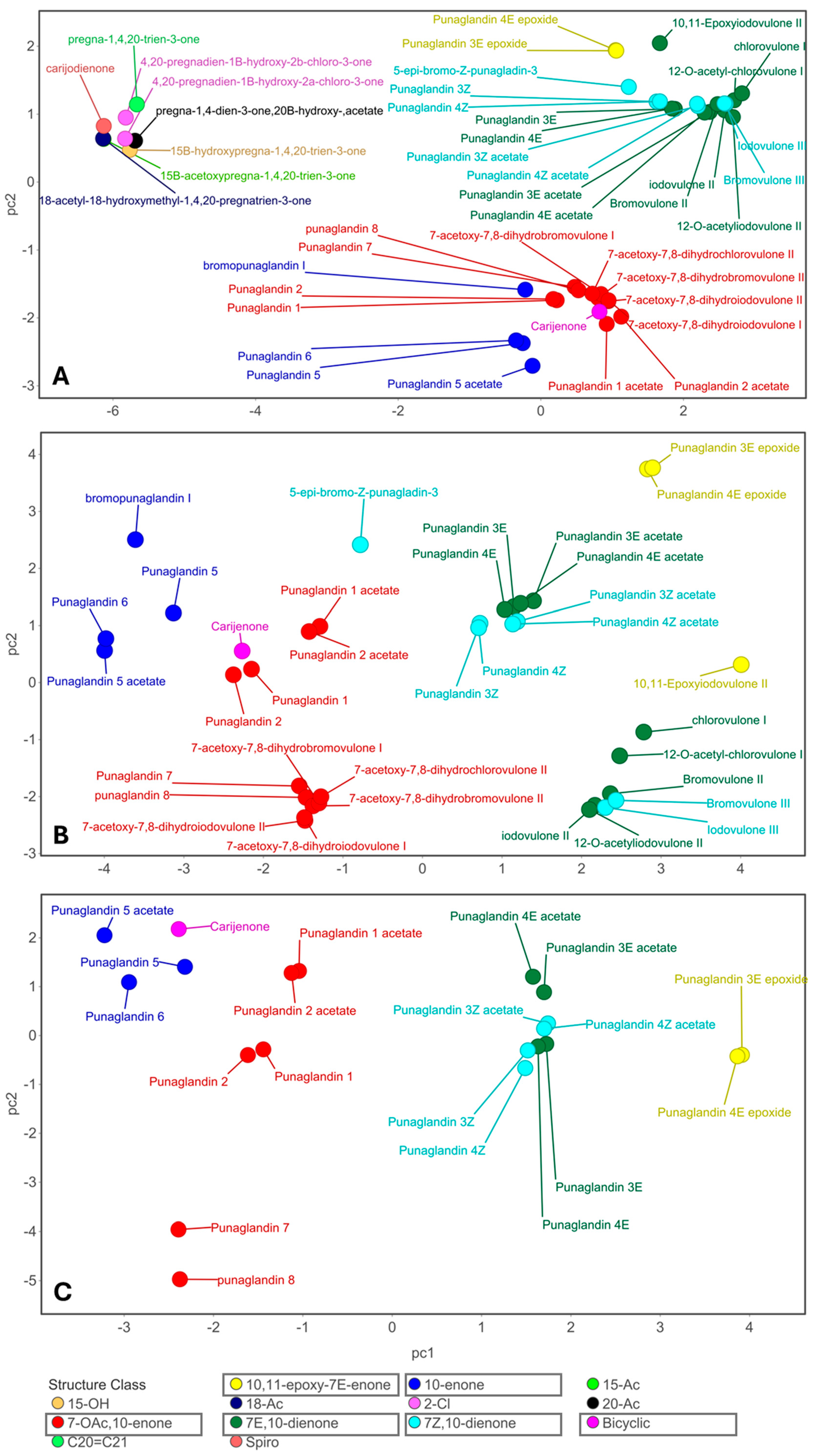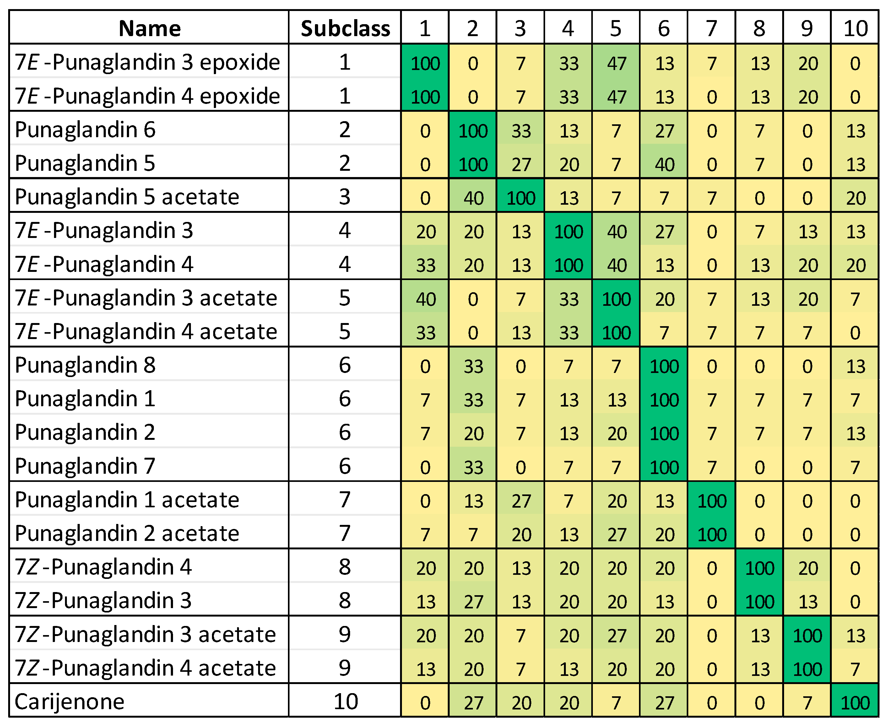 13C correlations that would be expected for a given punaglandin subclass, they still generated overall match scores equal to or exceeding 75% (