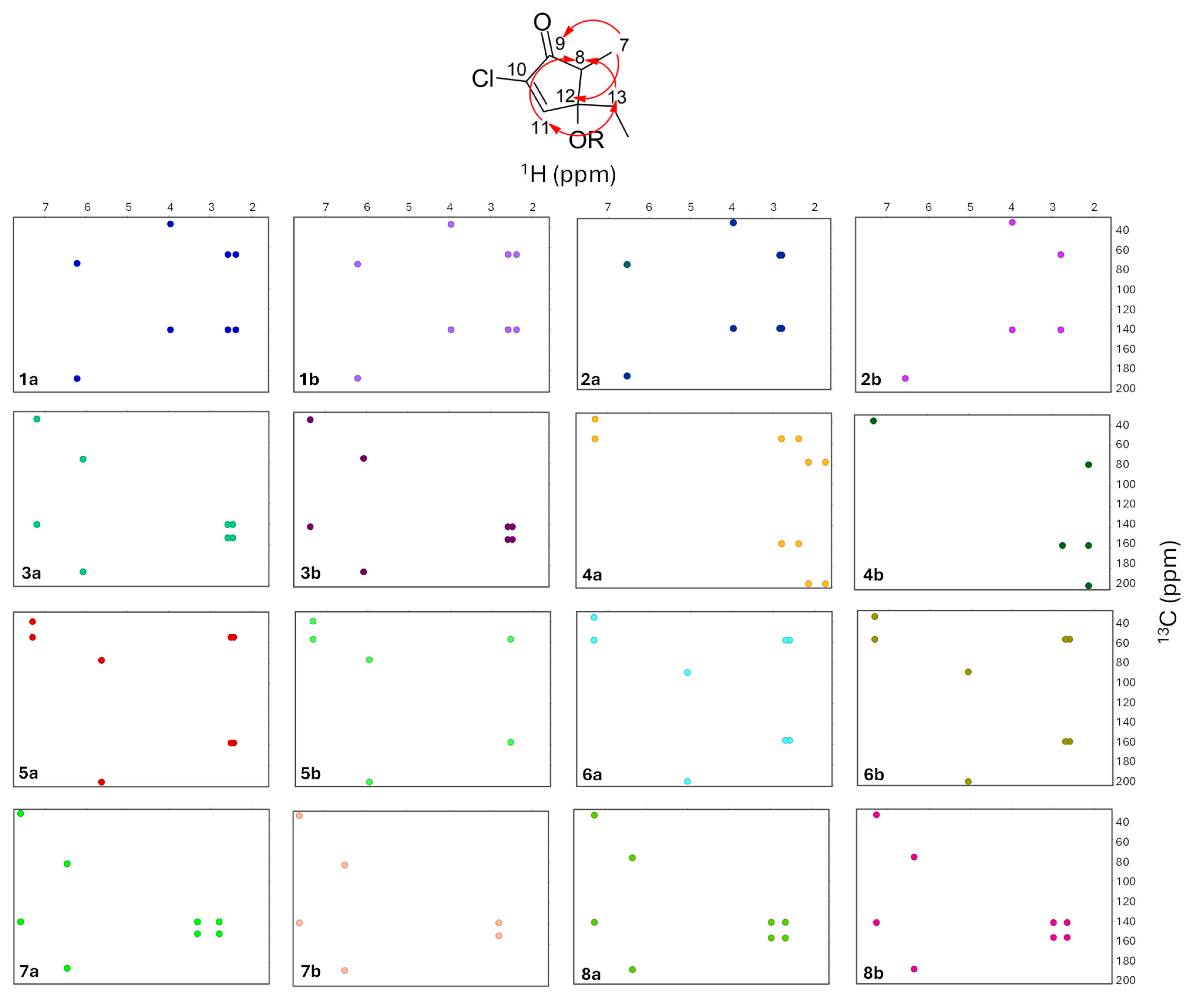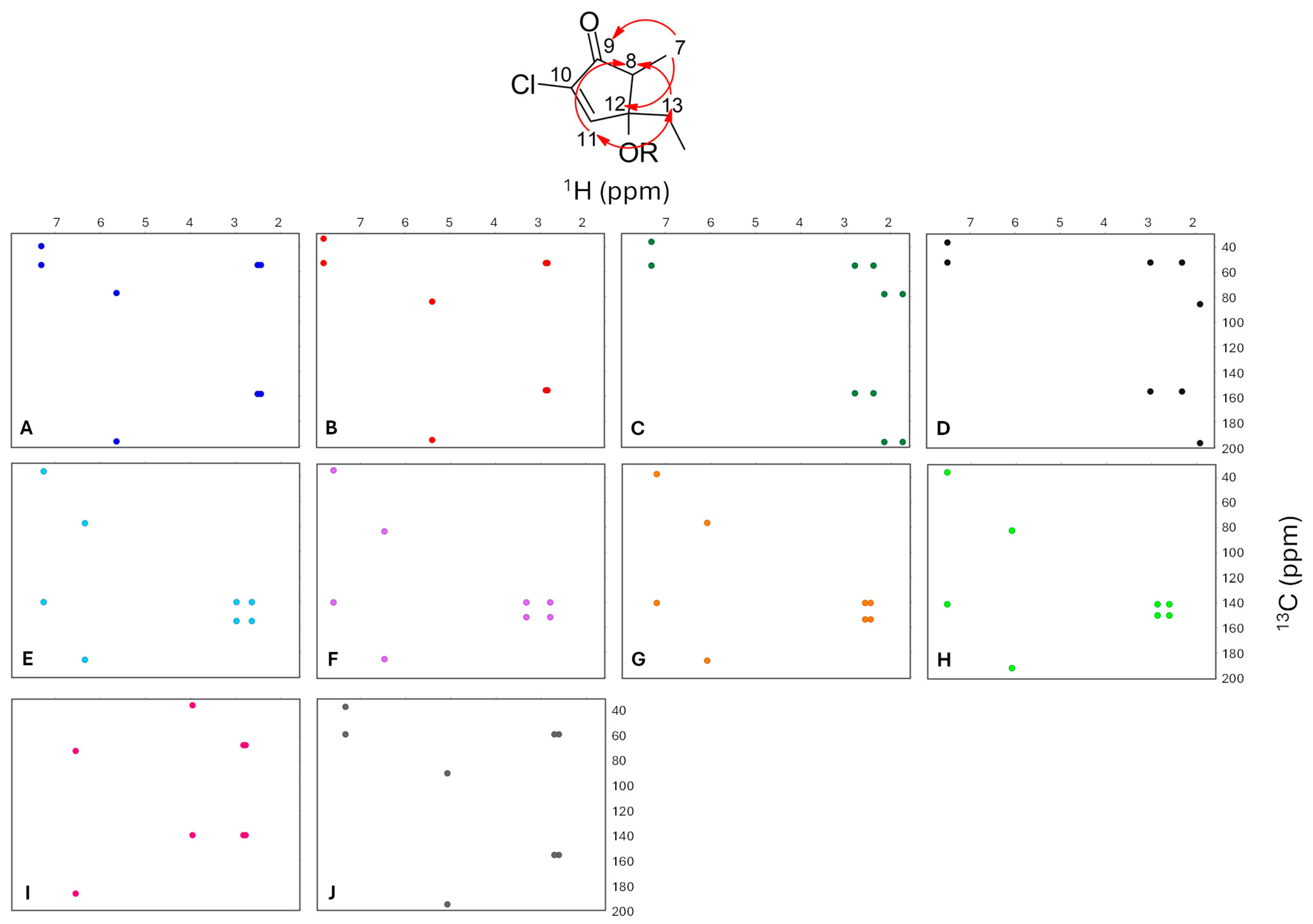 48], often occur at low natural abundance, and exhibit poor MS ionisation efficiency. The presence of multiple acetate groups along the alkyl side chain further reduces ionisation efficiency by suppressing proton affinity, thereby diminishing protonation during MS analysis and complicating conventional MS-guided dereplication. In this context, predictive approaches incorporating NMR data may provide a more reliable means of detecting punaglandins. The development of targeted NMR methods would therefore enable more focused and efficient identification of these compounds within complex mixtures.