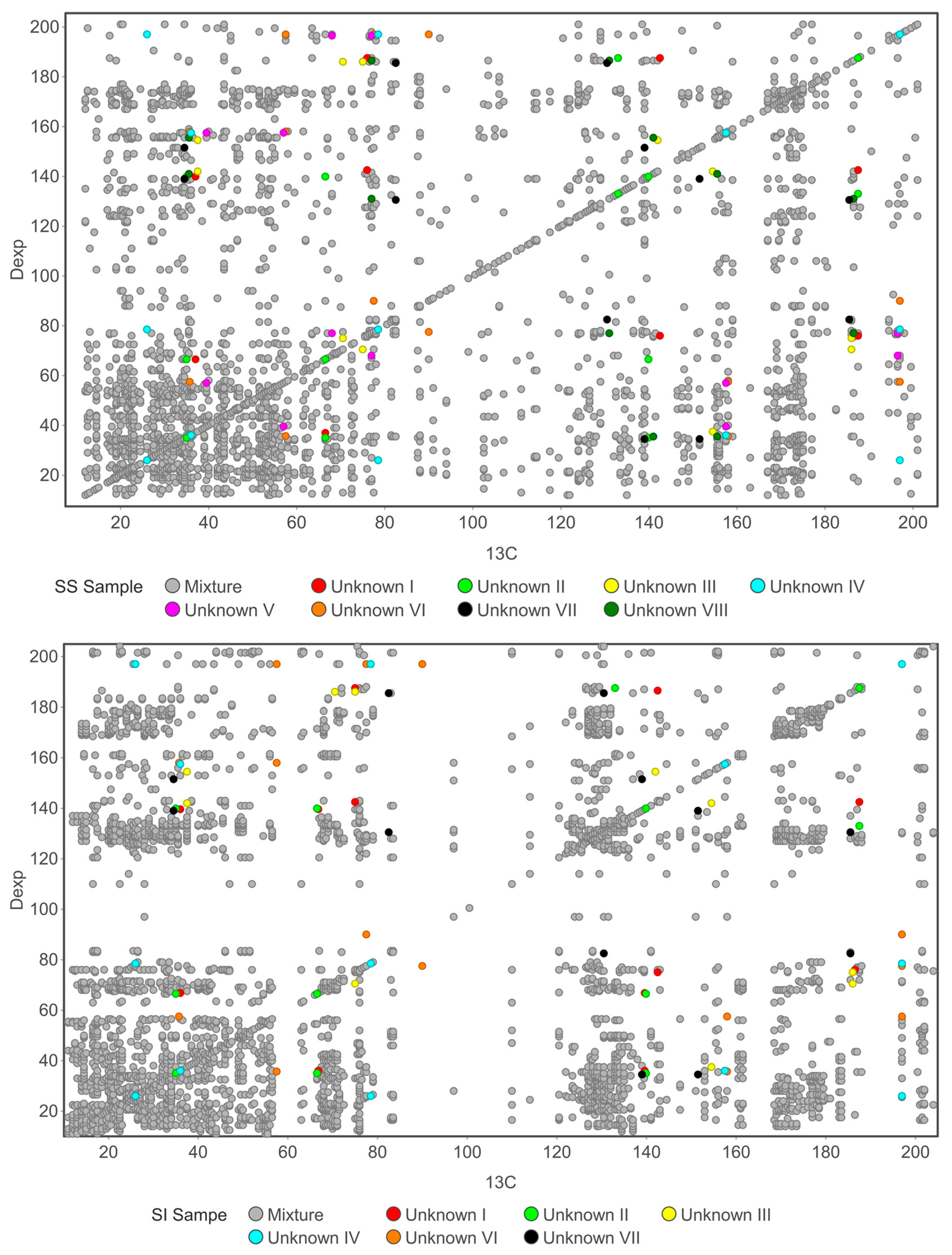 13C NMR signals in the mixture, we could match several of the unknowns within assigned substructure classes to data acquired on the previously isolated compounds. (