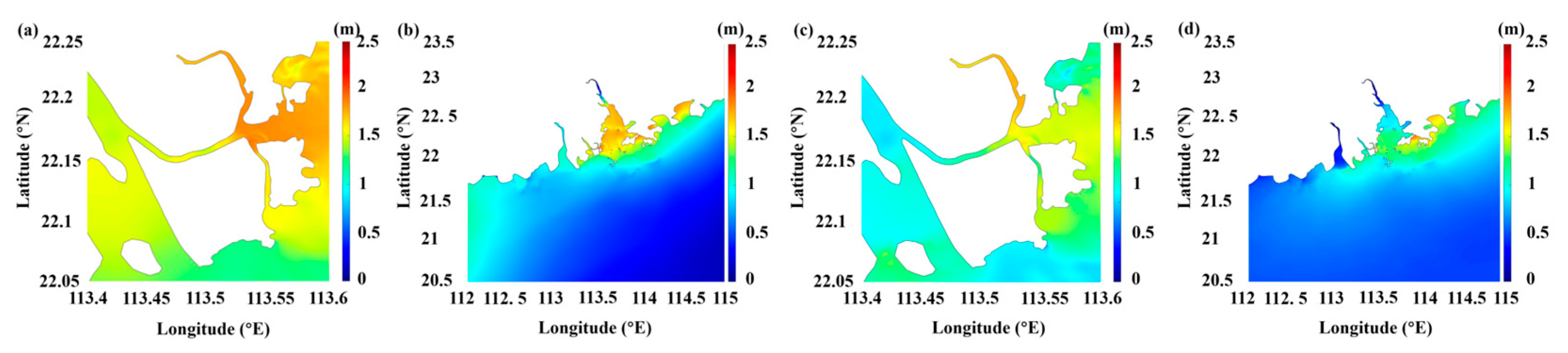 - Zhang, Z.; Guo, F.; Song, Z.; Chen, P.; Liu, F.; Zhang, D. A numerical study of storm surge behavior in and around Lingdingyang Bay, Pearl River Estuary, China. Nat. Hazards 2022, 111, 1507–1532. [Google Scholar] [CrossRef]