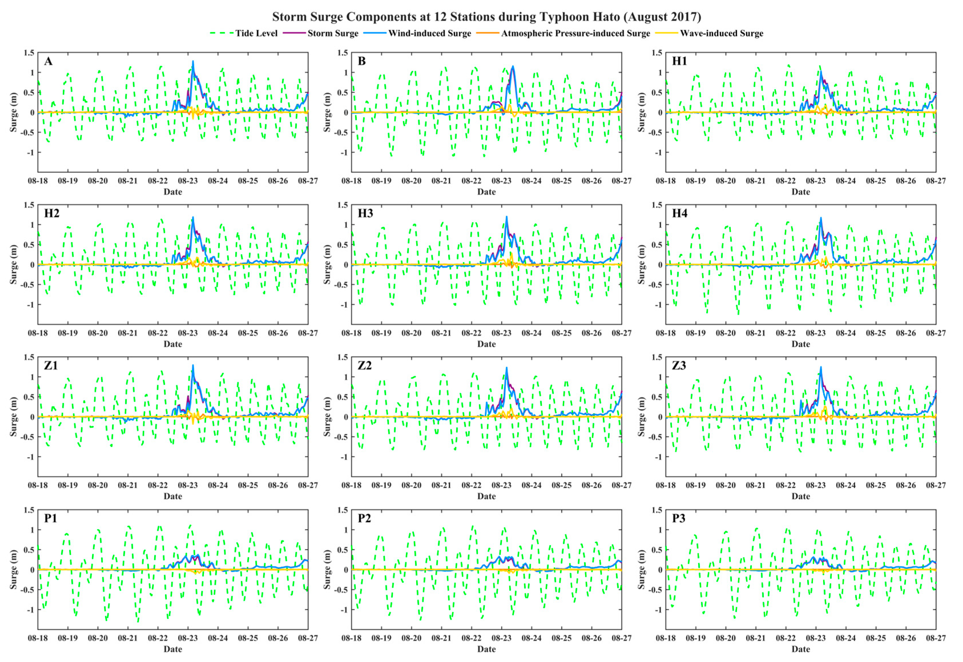 - Zheng, P.; Li, M.; Wang, C.; Wolf, J.; Chen, X.; De Dominicis, M.; Yao, P.; Hu, Z. Tide-Surge Interaction in the Pearl River Estuary: A Case Study of Typhoon Hato. Front. Mar. Sci. 2020, 7, 236. [Google Scholar] [CrossRef]