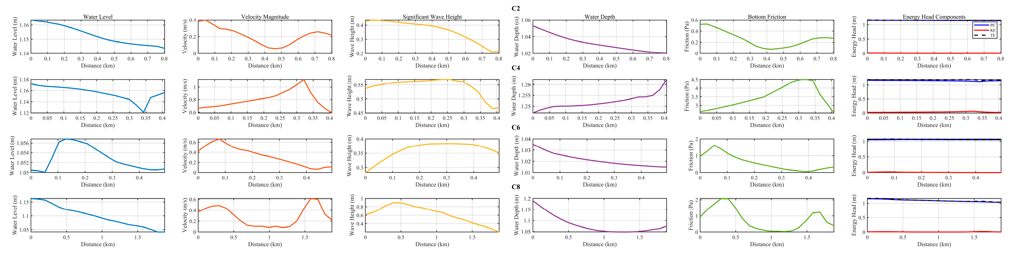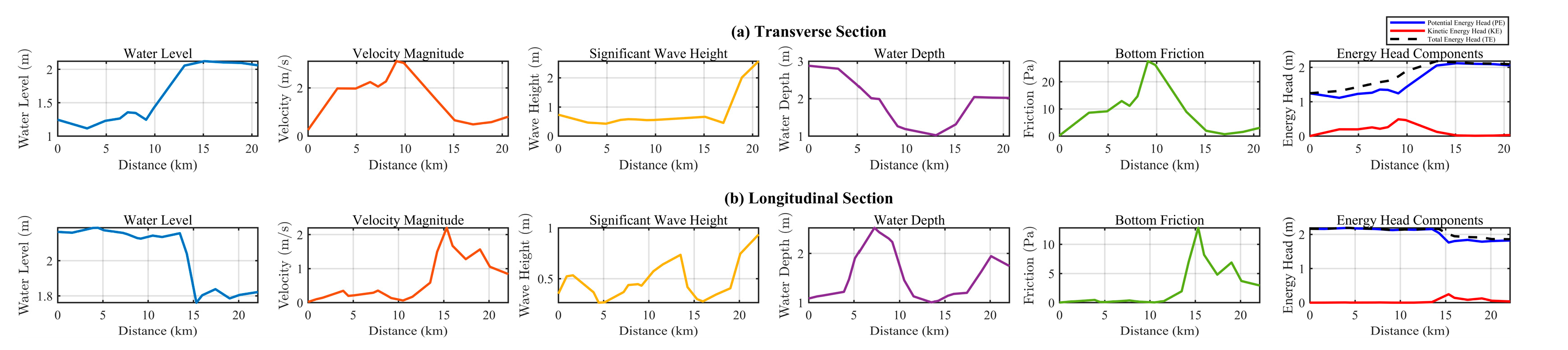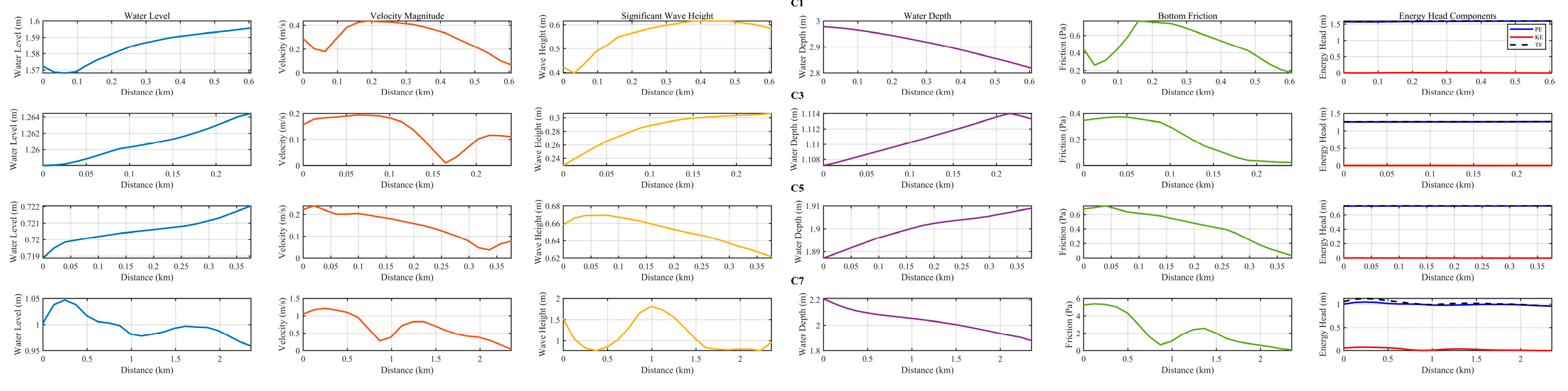 - The unique geomorphology of the MCTC acts as a natural funnel, making it a region of heightened vulnerability to storm surge disasters. This geometry induces storm surge amplification compared with the adjacent open coast, driven by a combination of geometric constriction and flow convergence. Energy transformation analysis based on the Bernoulli principle revealed distinct behaviors between the transverse and longitudinal waterways, with the constricted transverse waterway exhibiting a pronounced conversion from potential to kinetic energy, while the longitudinal waterway showed more gradual energy changes.