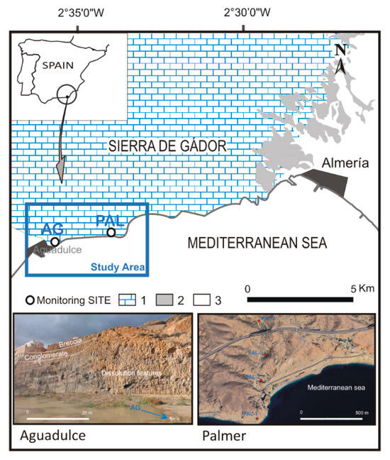 Location of the study area on a simplified geological map (1: Triassic dolostone, 2: Neogene deposits, 3: Quaternary alluvial). The two monitoring sites, Aguadulce and Palmer, are indicated. The locations of the drilled boreholes (AG, PAL-1, PAL-2, PAL-3, and PAL-4) are shown in the photographs below.