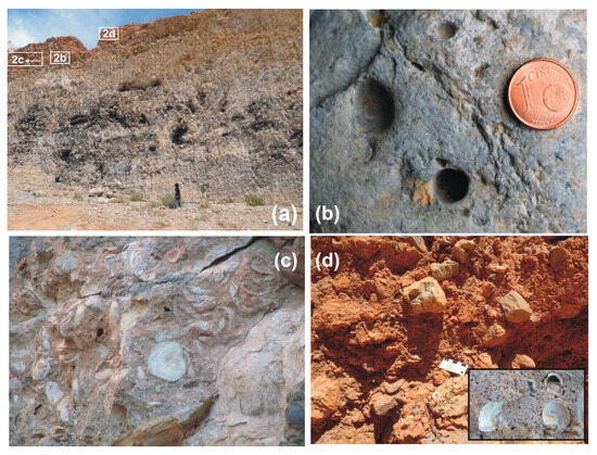 Aguadulce site. (a) Panoramic view of the cliff excavated in Triassic dolostone bedrock. (b) Close-up of the conglomerate perched on the cliff where Lithophaga borings are visible. (c) Accumulation of fossil remains, mainly composed of bivalves and red algae. (d) Dolomitic breccia supported by a reddish clay matrix. Gastropod fragments are locally present within the matrix.