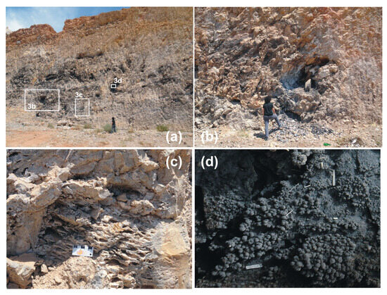 The Aguadulce discharge zone was located, prior to being dewatered due to overexploitation, at the base of the cliff, discharging directly onto the shoreline and into the sea [54]. In the same area, just above this discharge zone, and attached to the middle of the dolomitic cliff (Figure 2a), there exists a level of heterometric, well-rounded, coarse-grained conglomerates with frequent Lithophaga borings (Figure 2b). This conglomerate, with a thickness of 4 m, is situated at 18 m above sea level (a.s.l.). The clasts, up to 60 cm in diameter, consist of the same dolomites that form the substrate of the cliff. Between the clasts, there is a little matrix, which consists of medium-coarse siliciclastic sand. Towards the west, this conglomerate transitions laterally into a thin layer, approximately 80 cm thick, predominantly composed of fossilized remains of oysters (Ostreidae) and a smaller amount of red algae (Figure 2c). Above the conglomerate and the oyster bed are matrix-supported breccia outcrops containing dolomitic clasts embedded in a red clay matrix (Figure 2d). The clast sizes are heterometric, reaching up to 1.5 m in diameter. Locally, fossilized remains of the pulmonate gastropod Iberus gualtieranus, an endemic species from the Sierra de Gádor, can be found within this matrix (Figure 2d).