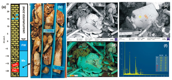Aguadulce site. (a) Synthetic lithostratigraphic column showing the position of Fe oxide precipitates. Adjacent to the column, the water table and bodies of fresh groundwater (FW) and mixed water (Mx) are indicated. (b) Details of core recovered from the zone with Fe oxide mineralization on the dolostone dissolution surface. (c,d) SEM images of barite crystals growing on Fe oxides in the mineralized zone with compositional analyses. (e,f) SEM image of a euhedral barite crystal and its compositional spectrum.