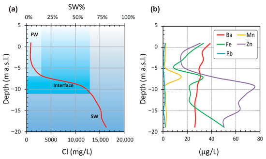 Aguadulce site. (a) Profile of Cl− ion concentration (mg/L) in groundwater along the AG borehole, correlated with the percentage of seawater. Freshwater (FW) and mixing zone are identified. (b) Profile of trace element concentrations (µg/L) in groundwater.