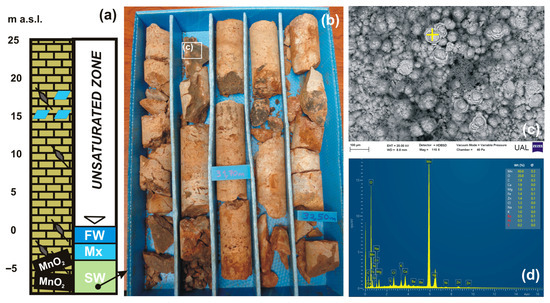 Palmer site. (a) Synthetic lithostratigraphic column showing the position of Mn oxide precipitates. Adjacent to the column, the water table and bodies of fresh groundwater (FW), mixed water (Mx), and seawater (SW) are indicated. (b) Details of core recovered from the zone with Mn oxide mineralization on the dolostone dissolution surface. (c,d) SEM images of botryoidal Mn oxide precipitates and its compositional spectrum.
