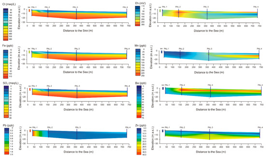 In the vertical profile from borehole AG (Figure 5b), Fe concentrations in groundwater decline progressively from the water table down to −5 m, followed by a local increase down to −7 m, and a further marked increase below −14 m, reaching peak concentrations at the piezometer base. Fe oxide precipitates observed in the core from this borehole are located between −18 and −21 m, a depth where groundwater salinity reaches approximately 75–80% of seawater (Figure 5a). In contrast, Mn oxides in the PAL-1 core were found at depths between −5 and −9 m, where salinity corresponds to 99% seawater. At this depth, Mn concentrations in groundwater are about 50 ppb, similar to seawater, while values of up to 250 ppb are recorded in the more inland, reducing zones of the aquifer (Figure 7). This indicates that Mn comes from the dissolution of the Sierra de Gador carbonate massif, as does Ba. This massif contains numerous Pb and Zn (F, Ba) mineralizations that have been mined until recently [71].
