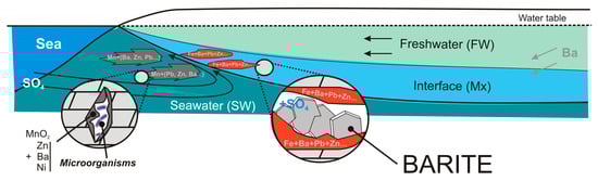 A similar model, albeit without the prerequisite of Fe/Mn oxide precipitation, has been proposed to explain barite mineralization in carbonate formations of northeastern British Columbia [83]. In that scenario, Ba-rich continental groundwater interacting with SO42−-rich marine water infiltrating the coastal aquifer results in barite precipitation at the mixing zone.
