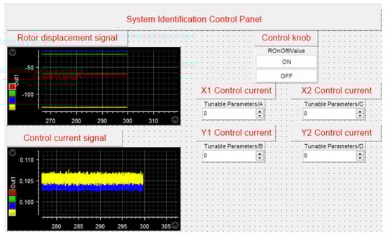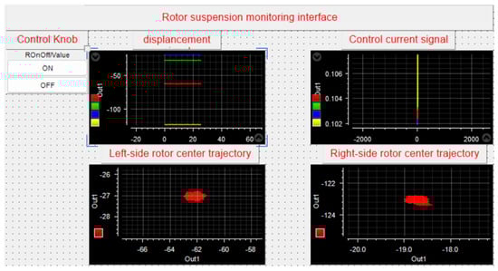First, when the HMB is in a stationary state, use the aforementioned PID parameters to conduct the rotor levitation experiment, verifying the effectiveness of the PID parameters. Then, in the levitation state, change the motor speed to 500 rpm and 1000 rpm, respectively, observe the stability of the rotor levitation, and further validate the control performance. Finally, apply an external excitation force to the rotor by exciting the magnetic bearing to verify the system’s anti-interference capability. Utilize dSPACE to monitor the control performance and collect the changes in rotor displacement and the magnitude of the control current. The dSPACE monitoring interface is shown in Figure 27.