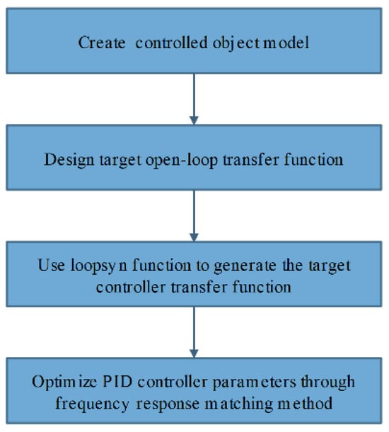 The loop-shaping methodology [,] systematically designs the frequency-domain characteristics of the open-loop transfer function and computes PID parameters through a mixed-sensitivity optimization framework. This approach embeds frequency-domain robustness constraints while preserving the structural simplicity of PID control, thereby ensuring both sufficient stability margins and maintained stability under parameter perturbations and external disturbances. The controller design methodology based on the loop-shaping approach is illustrated in Figure 13.