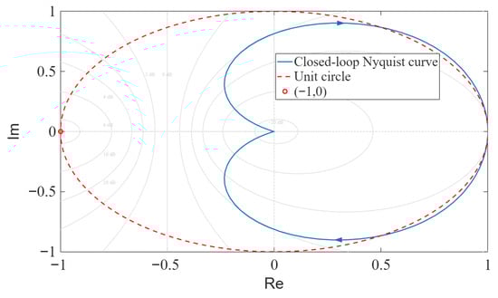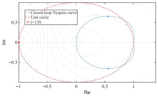 Based on the obtained system transfer function and control parameters, the Nyquist plots of the closed-loop transfer functions for both HMB systems are plotted. The Nyquist plot of the closed-loop transfer function for the left HMB system is shown in Figure 14, and that for the right HMB system is shown in Figure 15.